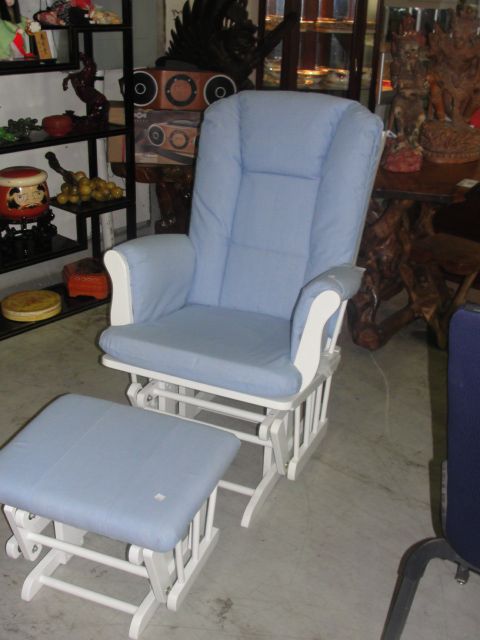 BABY BLUE UPHOLSTERED AND WHITE GLIDING ROCKER WITH MATCHING FOOTSTOOL