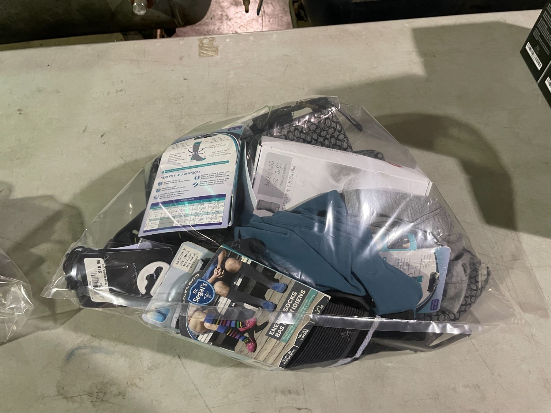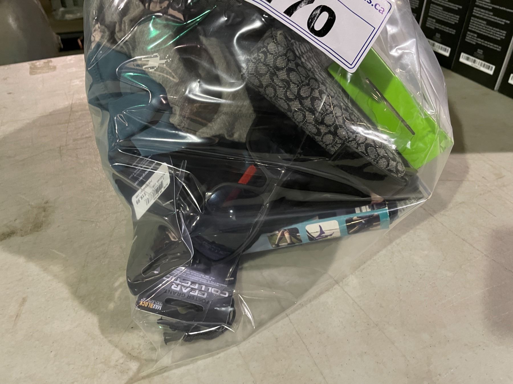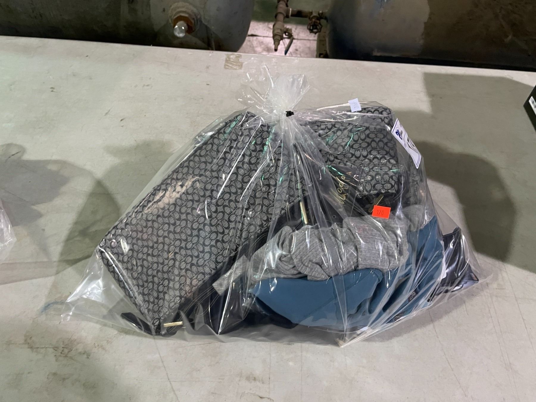 BAG OF ASSORTED CLOTHES, SOCKS, PURSES, SUN GLASSES & BELKIN USB PLUG
