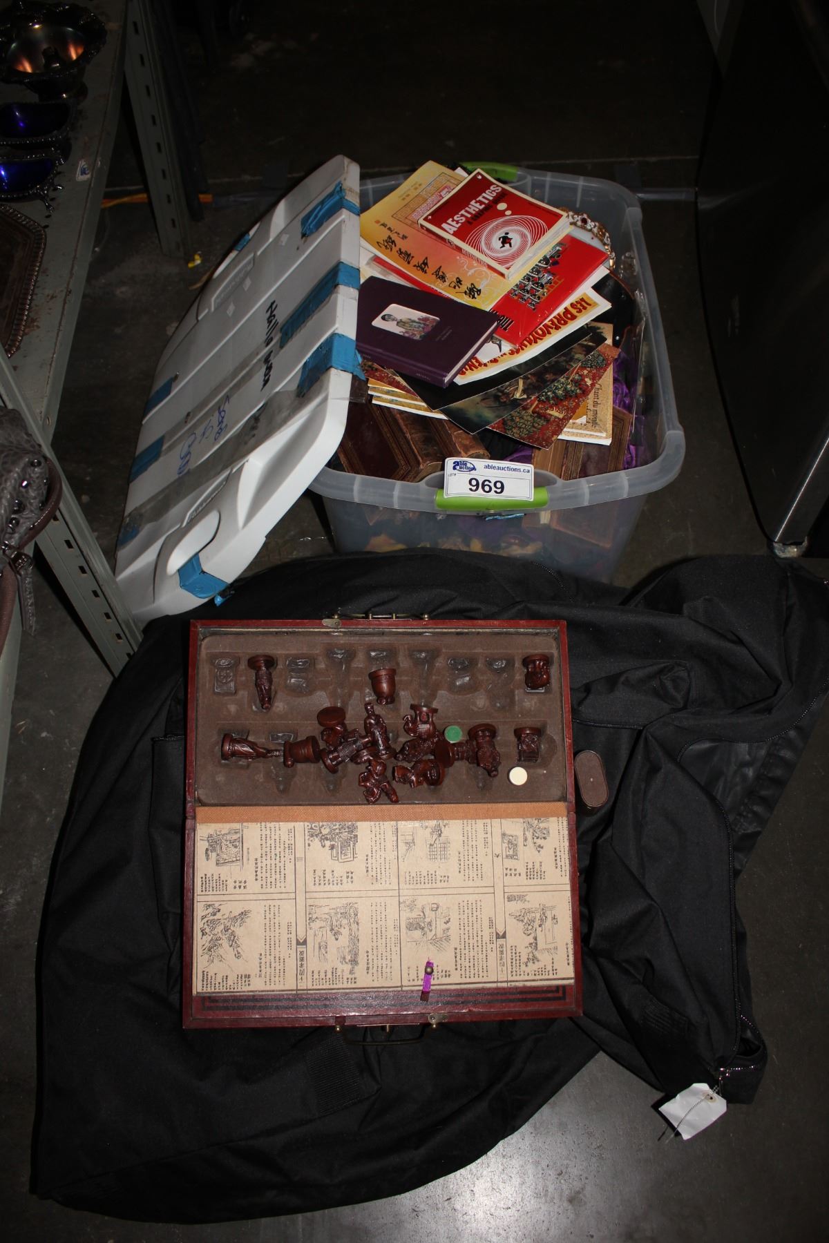 BAG OF ASSORTED CLOTHING AND BIN OF BOOKS, GAMES AND ART