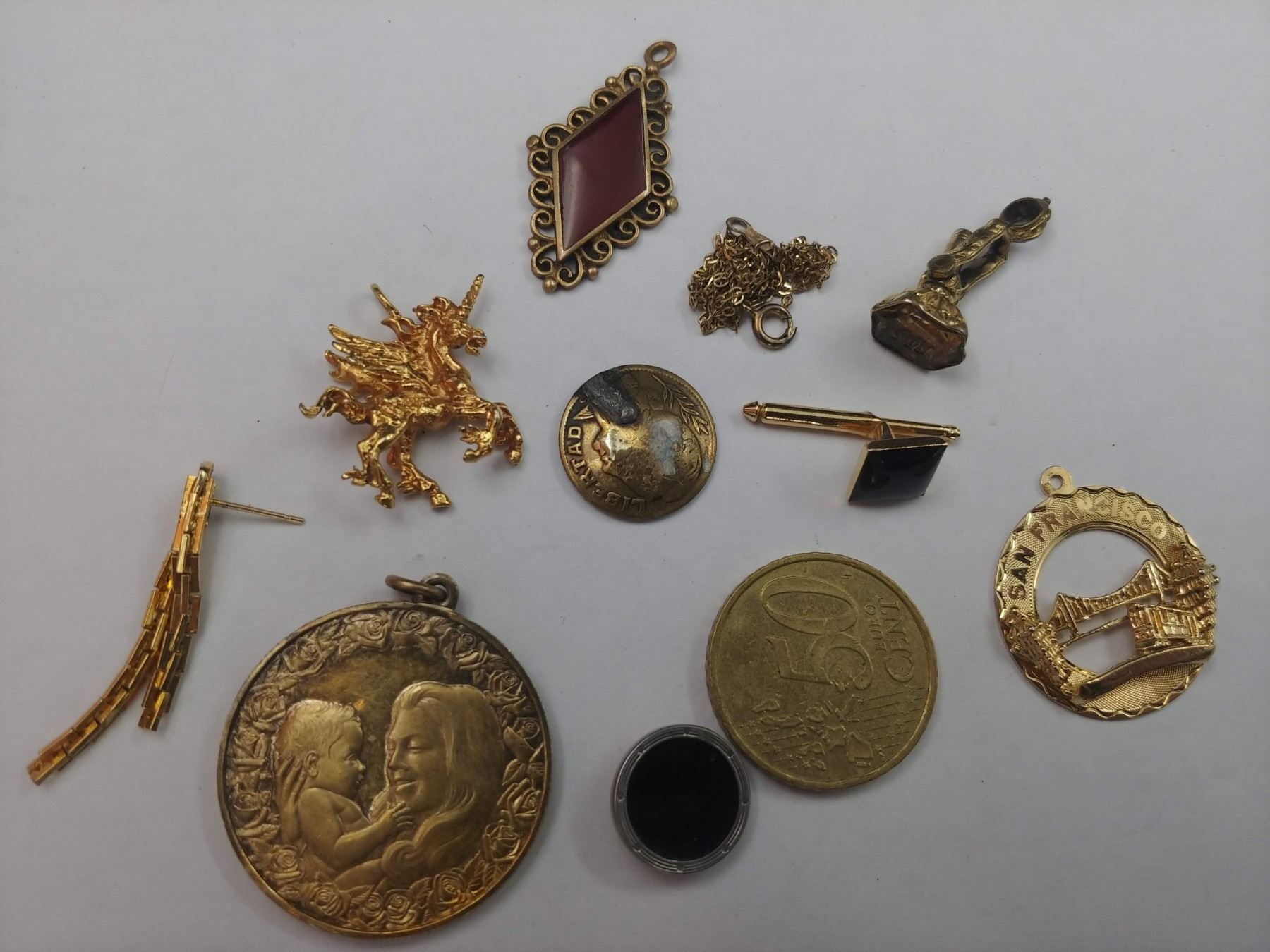 BAG OF ASSORTED GOLD COLOURED JEWELRY AND COINS