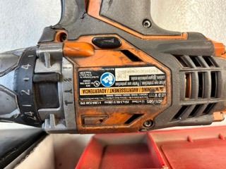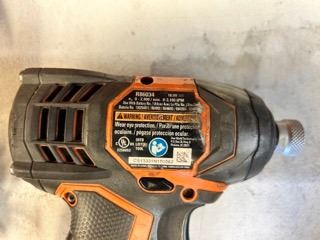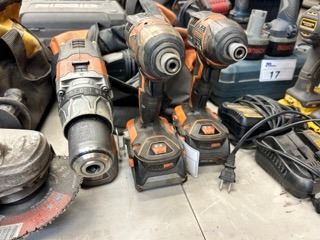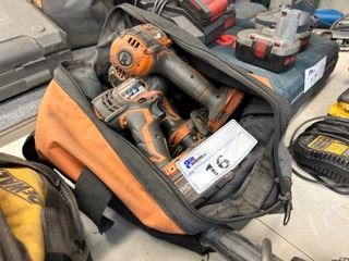 BAG OF ASSORTED RIDGID CORDLESS TOOLS INCLUDING: 2 RIDGID R86034 CORDLESS IMPACT DRIVERS WITH BATTERIES, RIDGID CORDLESS DRILL NO BATTERY, & BATTERY CHARGER