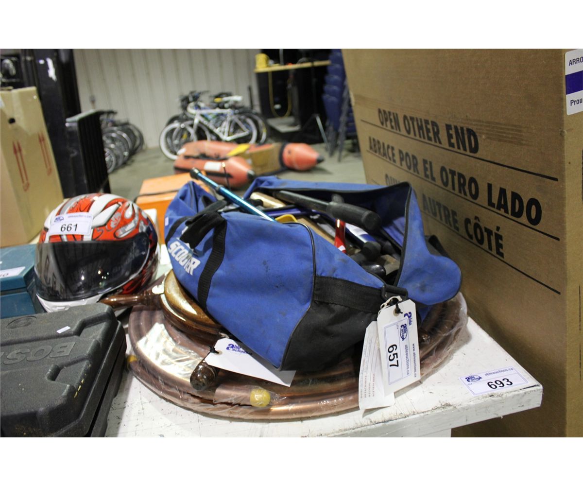BAG OF ASSORTED TOOL, COPPER TUBING AND BOAT WHEEL