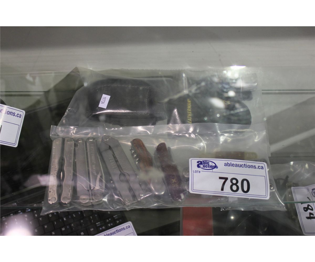 BAG OF LEATHERMANS AND POCKET KNIVES