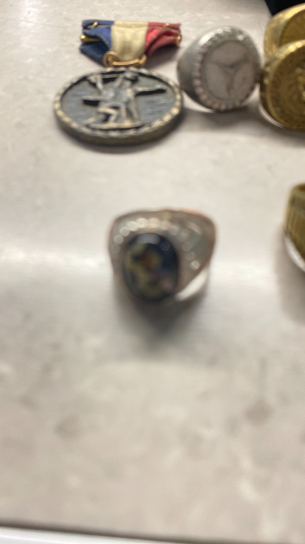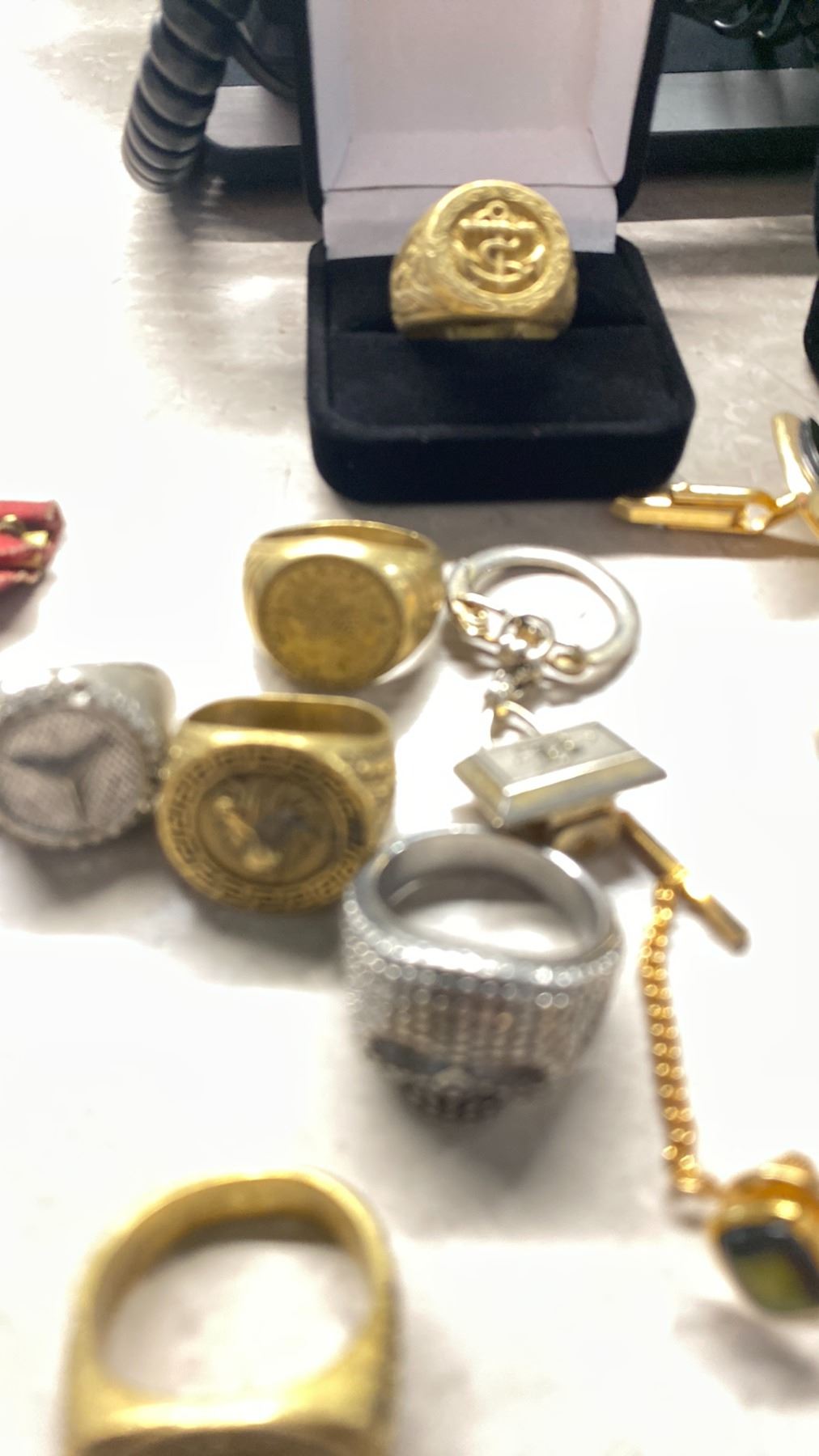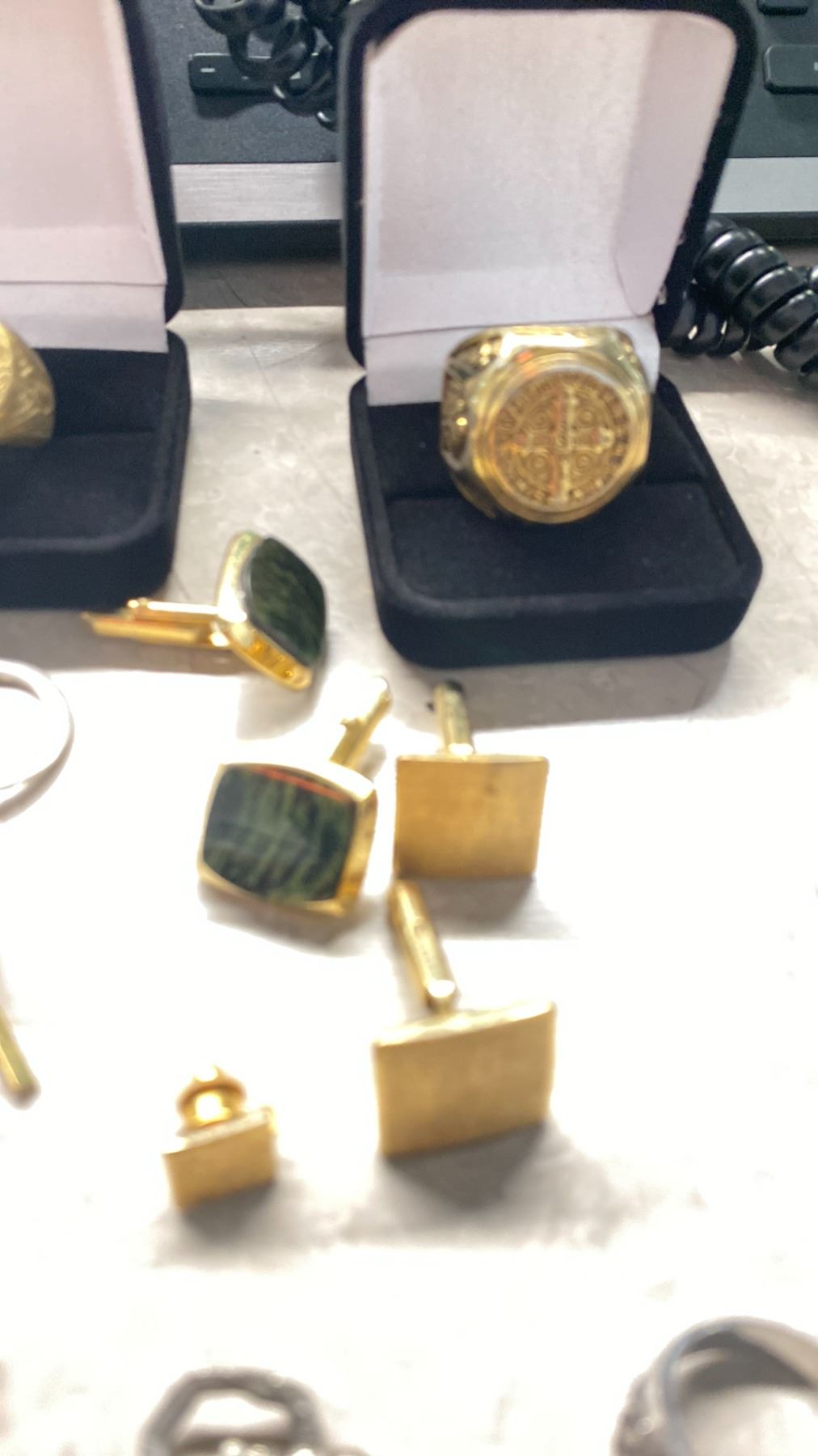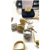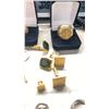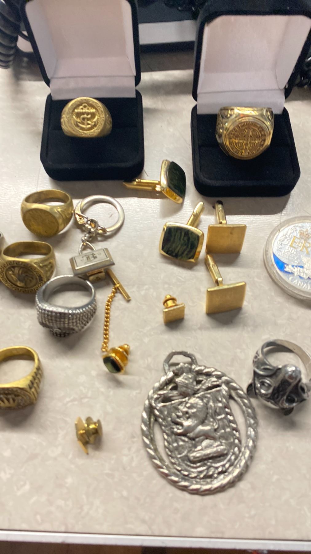 BAG OF MENS JEWELRY & MISC INCLUDING RINGS, CUFF LINKS, METALS, COIN & MORE