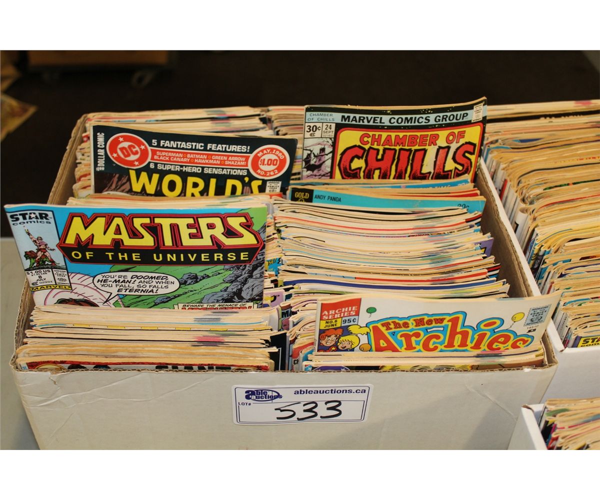 BANKERS BOX OF BRONZE TO COPPER AGE COMICS - MIXED TITLES & RUNS. HOLDS APPROX. 250-300 COMICS, MIXED GRADES.