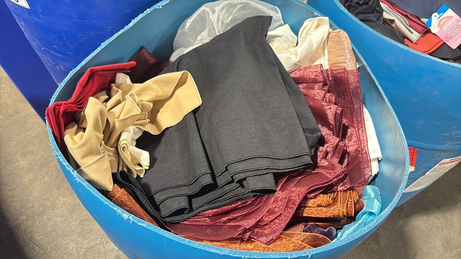 BARREL FULL OF ASSORTED SIZE/LENGTH/COLOR BANQUET LINENS *BARREL INCLUDED*