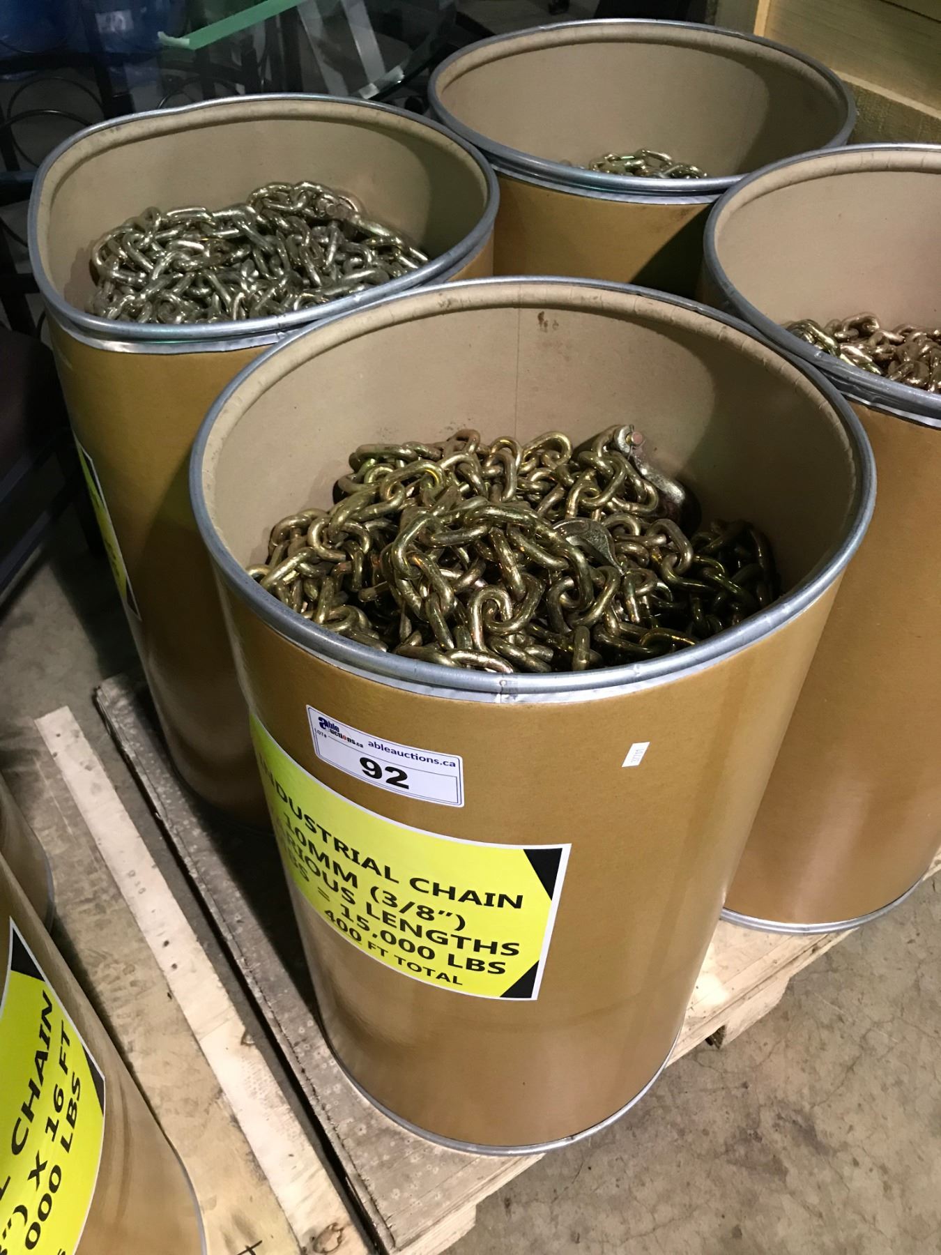 BARREL OF VARIOUS LENGTHS OF 10MM ( 3/8" ) INDUSTRIAL CHAINS WITH GRAB HOOKS 400' TOTAL