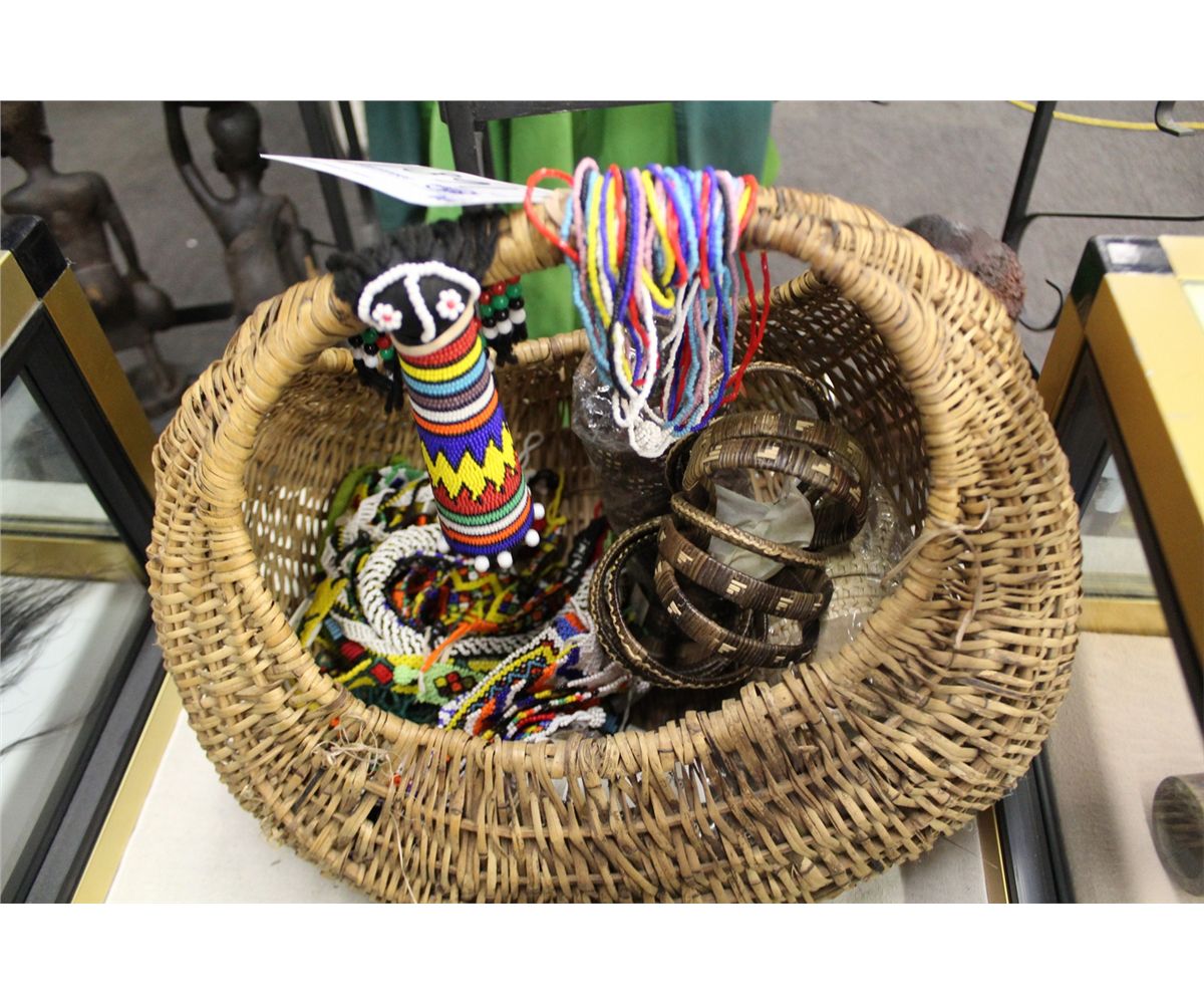 BASKET CONTAINING DOZENS OF RATTAN AND BEADED BRACELETS 15 X NECKLACES AND 13 X BRACELETS