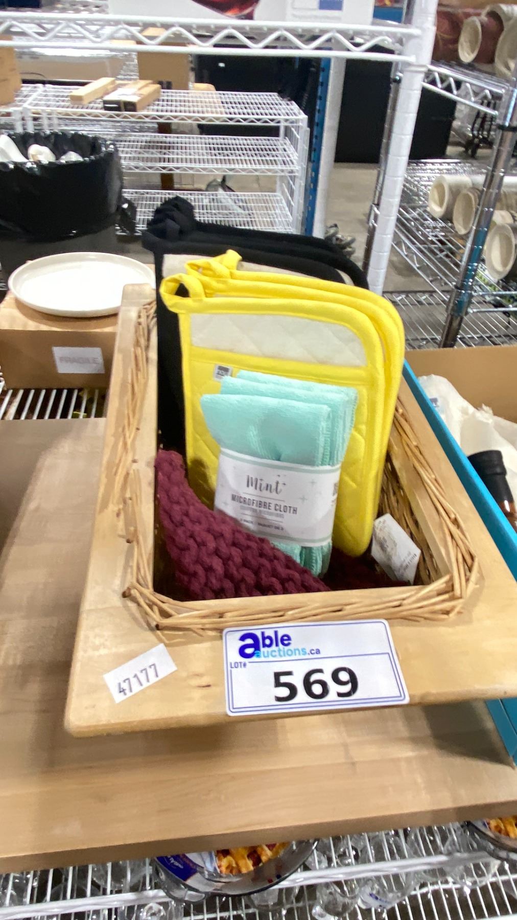 BASKET OF ASSORTED MICROFIBER TOWELS, OVEN MITS AND SCRUBBERS