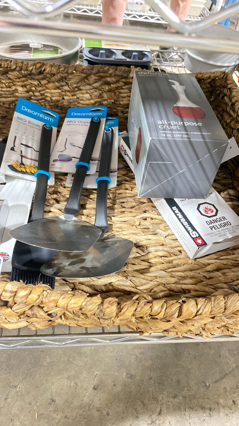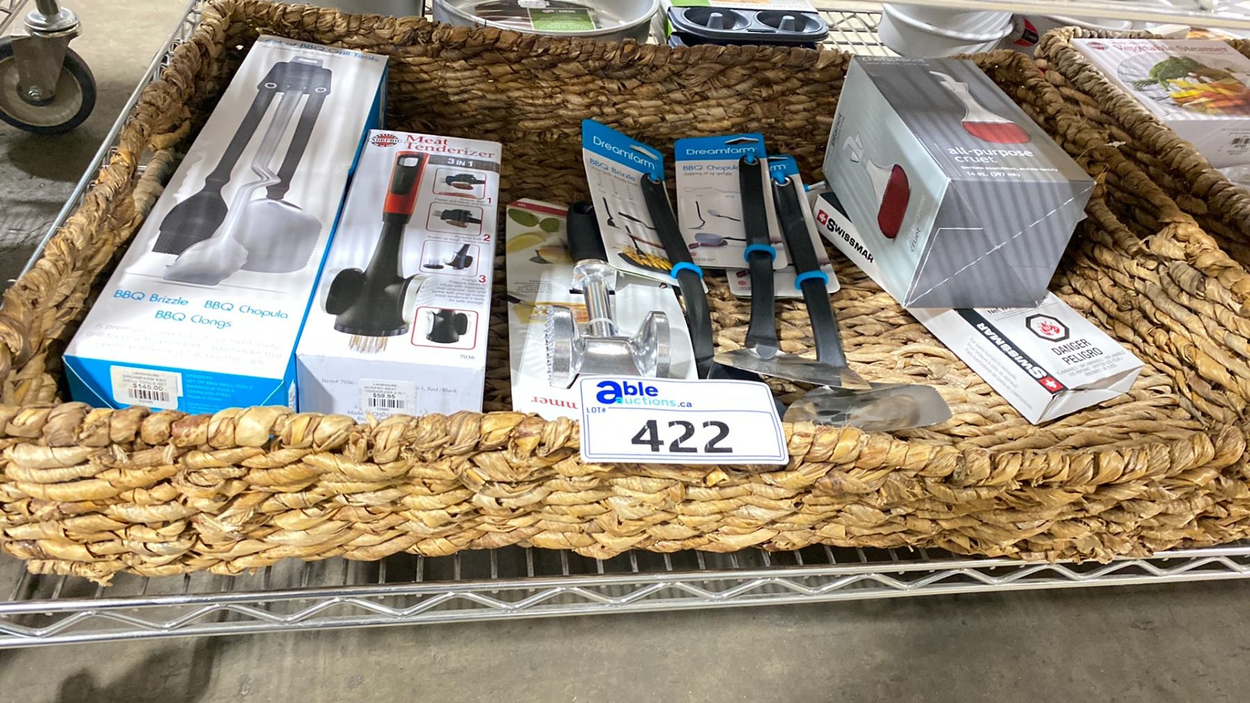 BASKET WITH MEAT HAMMER, METAL SPATULAS, BBQ ACCESSORIES AND MORE