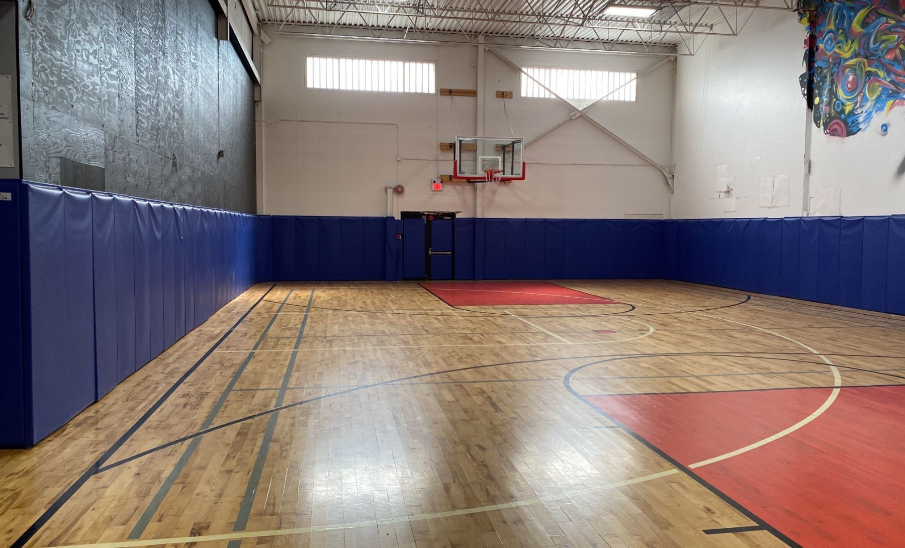 BASKETBALL COURT; MAGNETIC FLOATING FLOOR AND BOTH HOOPS WILL REQUIRE 2 PEOPLE AND 20' LADDER TO REMOVE
