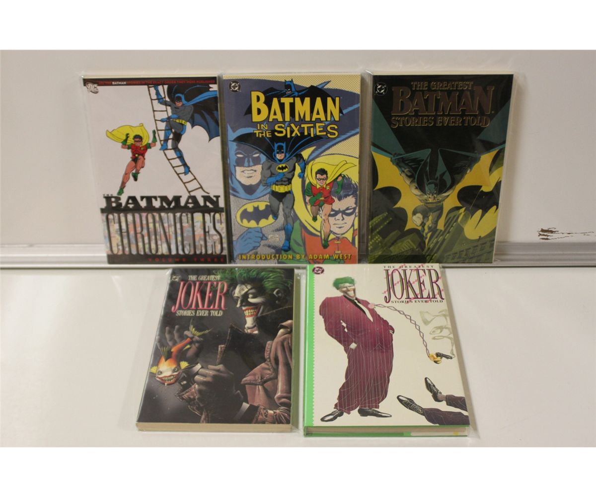 BATMAN 5 TRADE PAPERBACKS. INCLUDES 1 HARD COVER. OUT OF PRINT & NEW. HIGH GRADE.