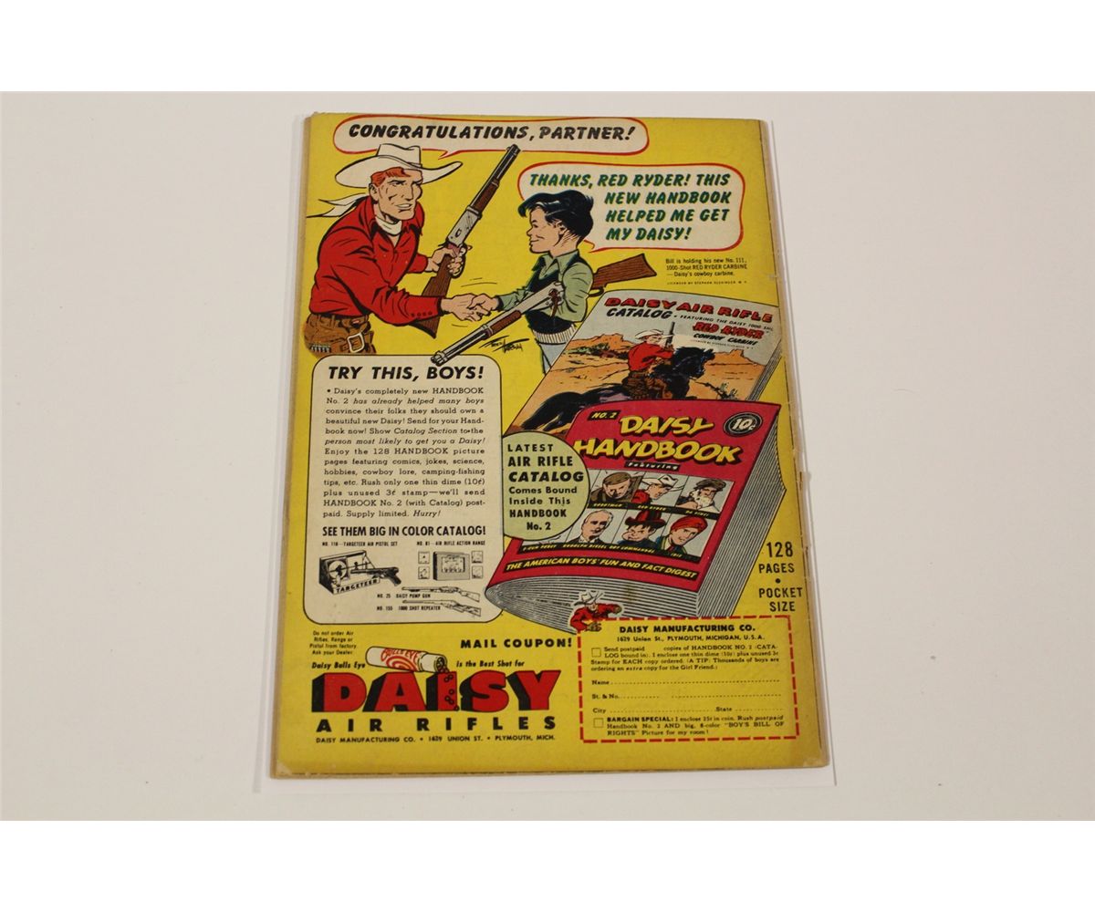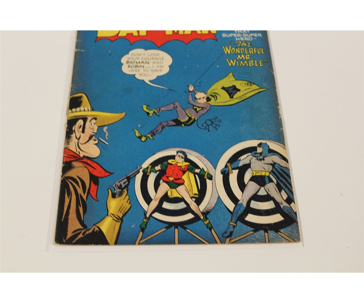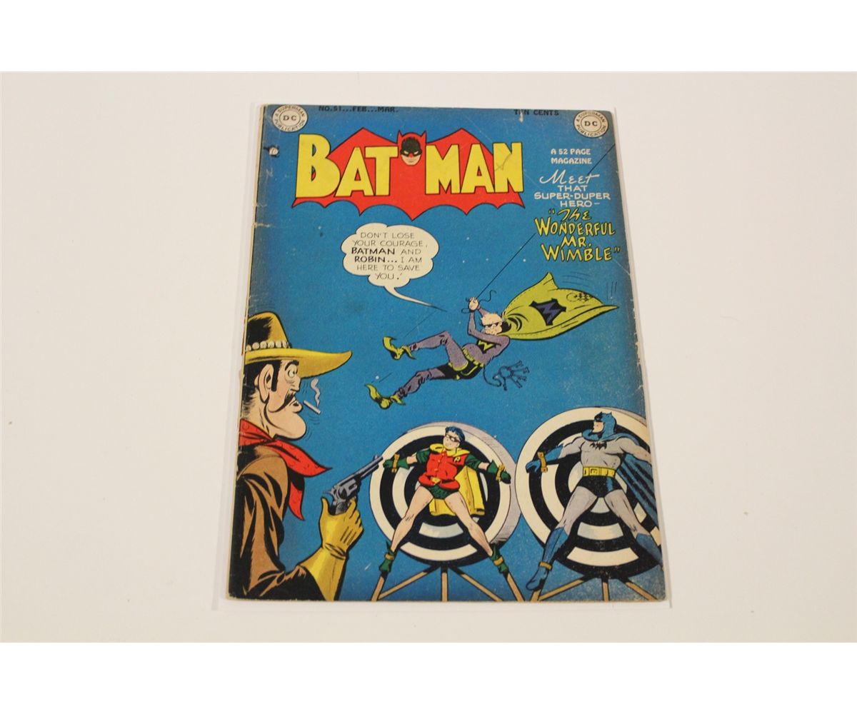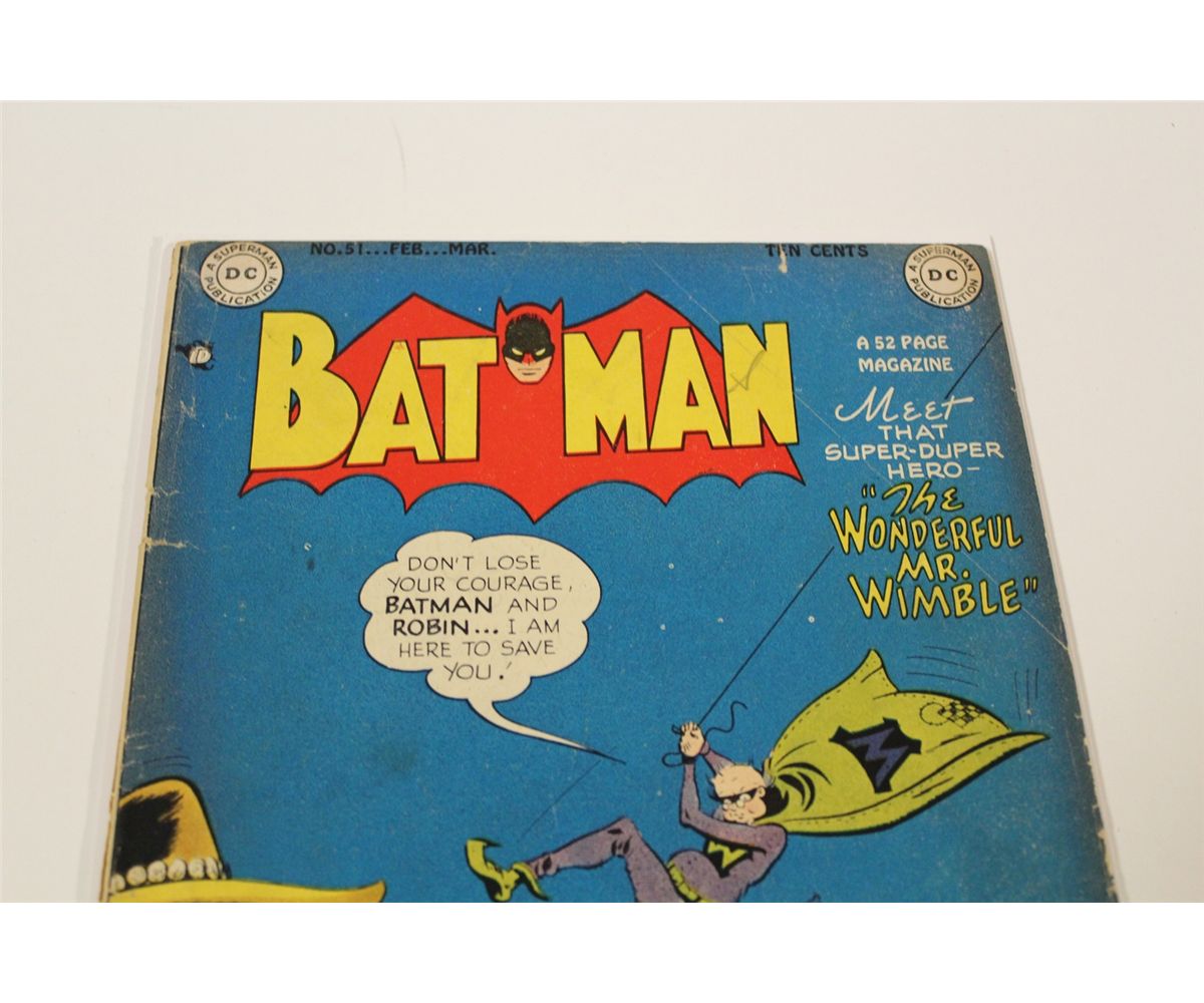 BATMAN #51 (1949) TOUGH TO LOCATE 1940'S GOLDEN AGE, CLASSIC BATMAN. LOWER MID TO MID GRADE, COVER DETACHED AT BOTTOM STAPLE & 1' SPINE SPLIT AT MIDDLE OF SPINE, OTHERWISE VERY SHARP COPY, FLAT, GLOSSY & SUPPLE, A NICE EXAMPLE!