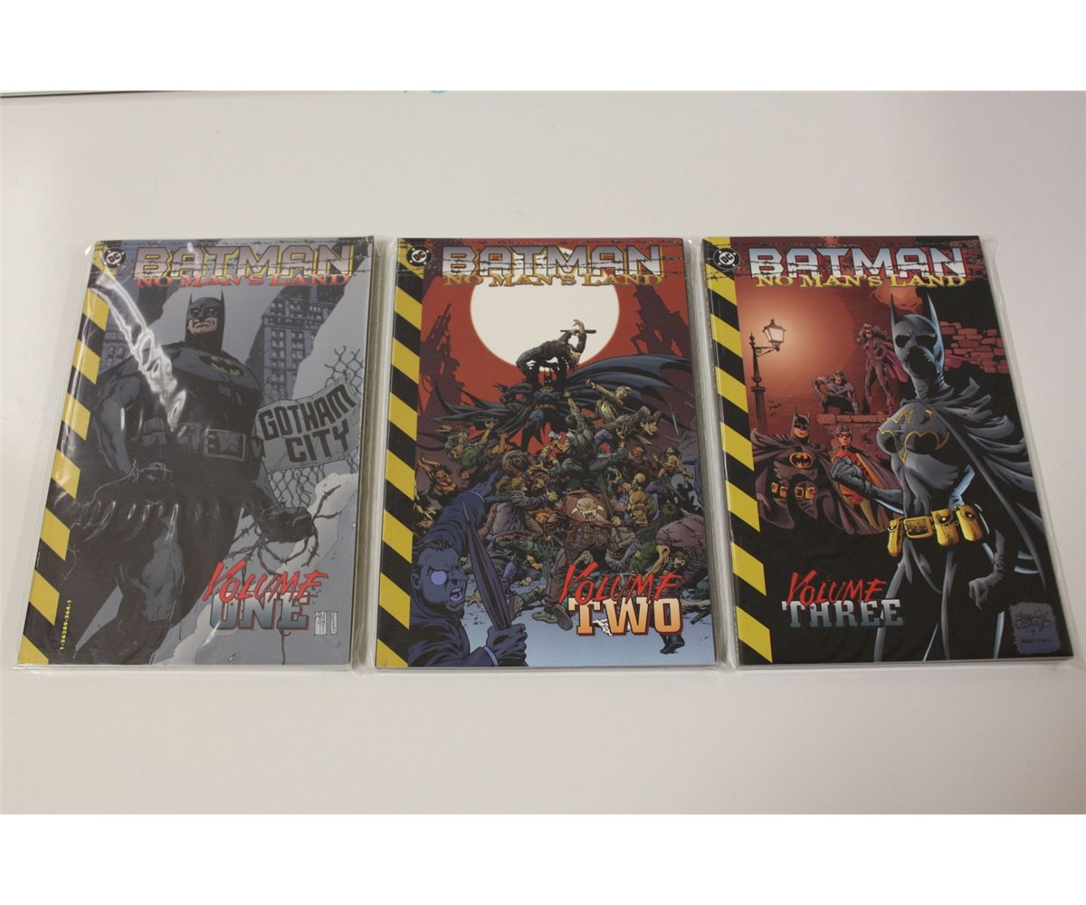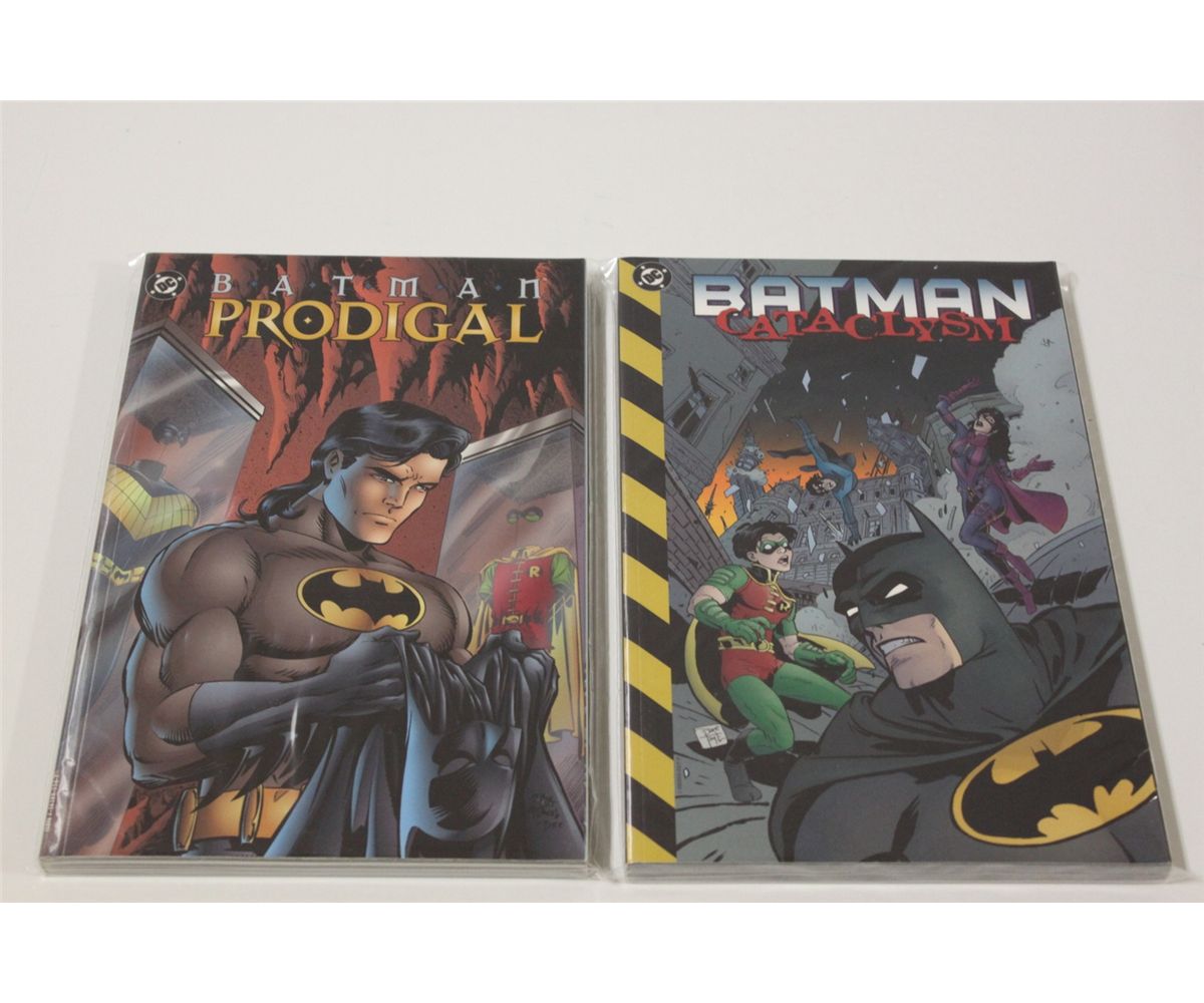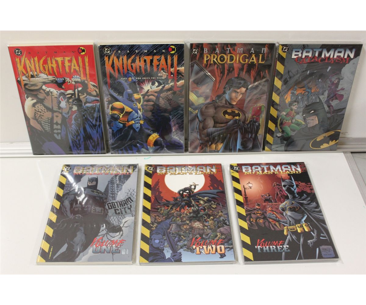 BATMAN OUT OF PRINT CLASSIC STORY LINES LOT: 7 TRADE PAPERBACKS. KNIGHTFALL. VLOUME 1 & 2, PRODIGAL,, CATACLYSM, & NO MAN'S LAND VOL. 1, 2 & 3. HIGH GRADE