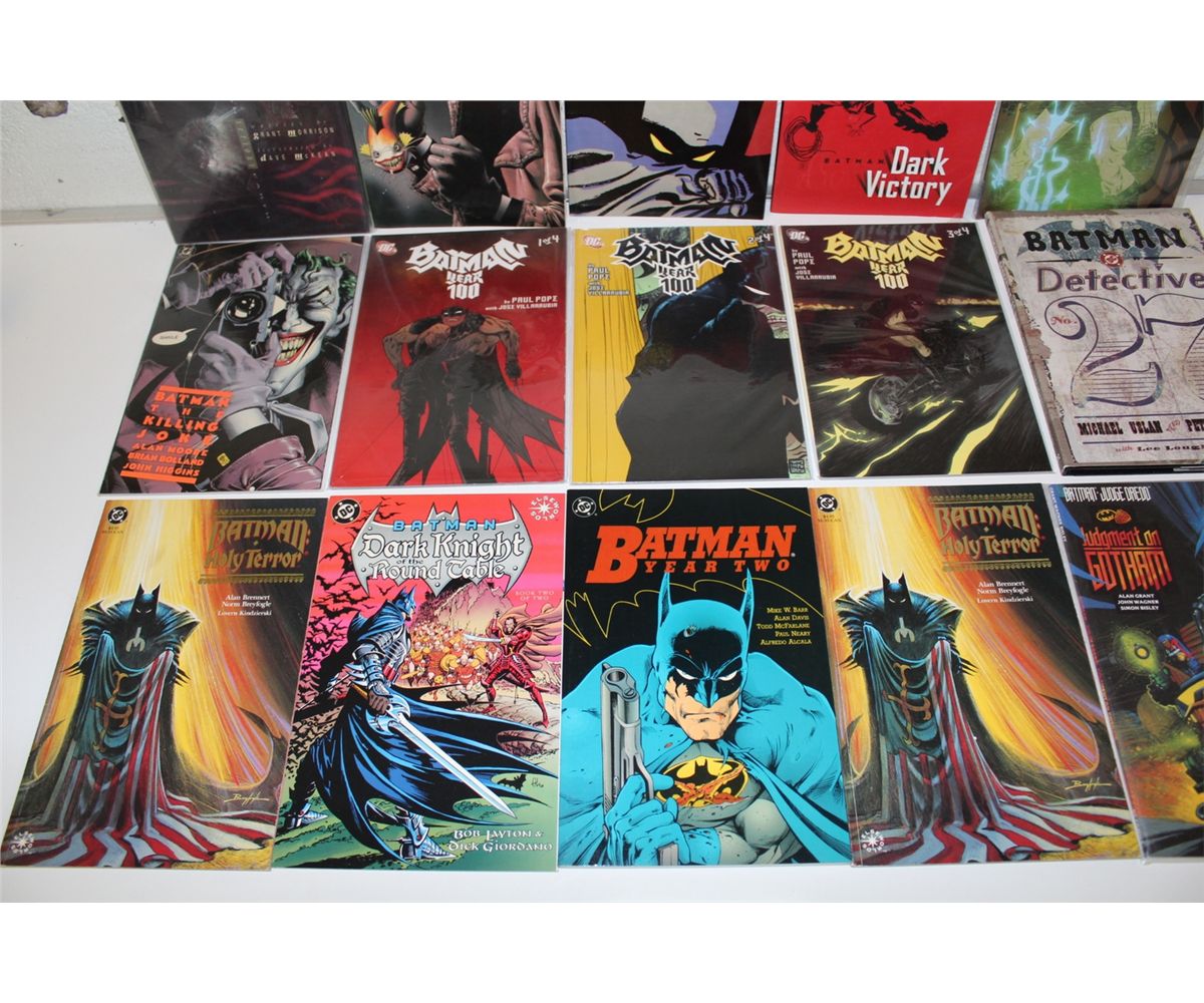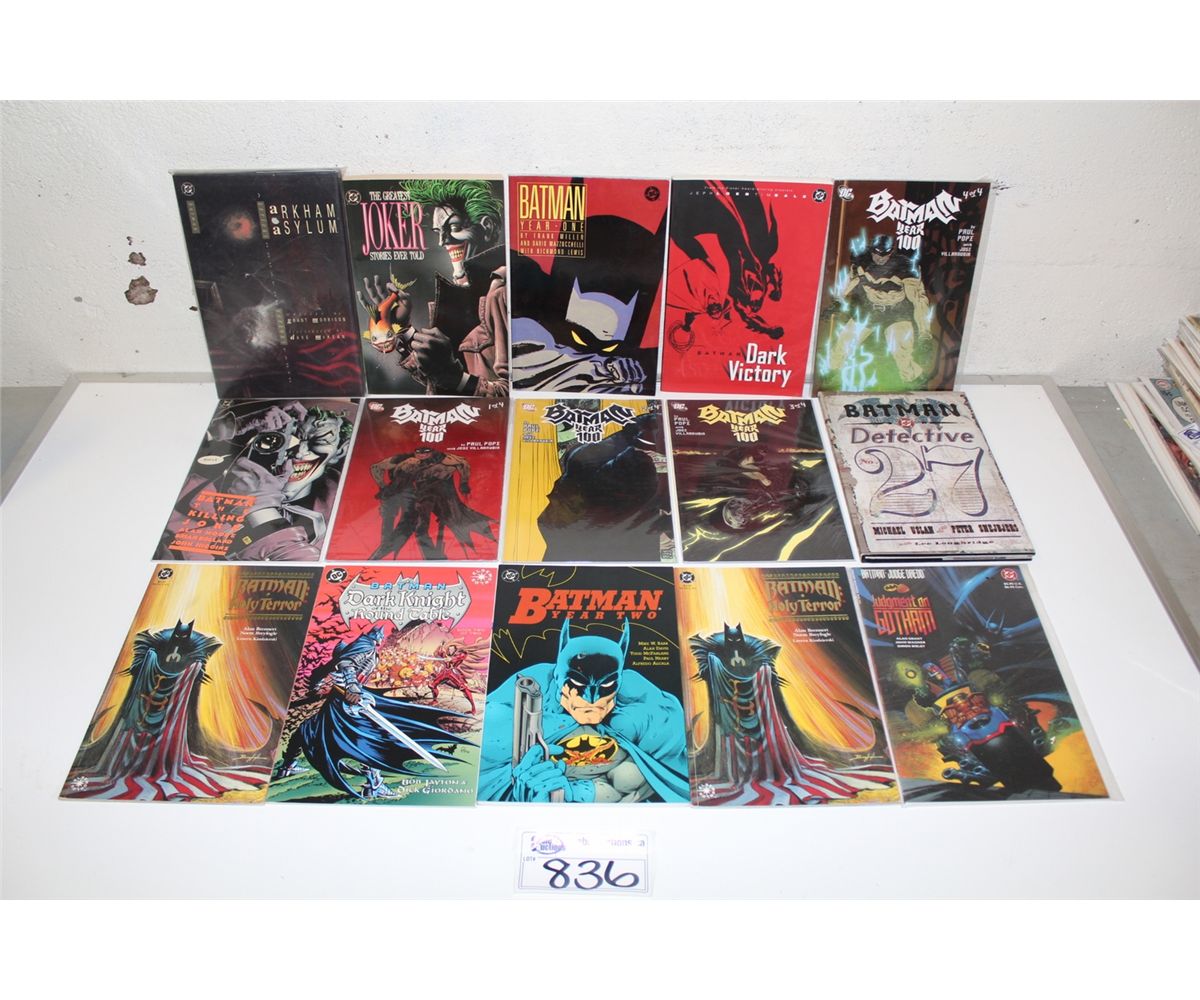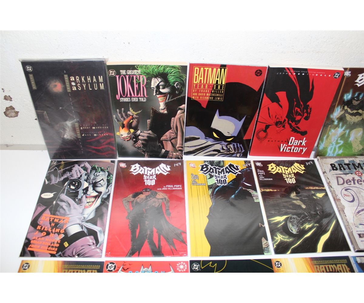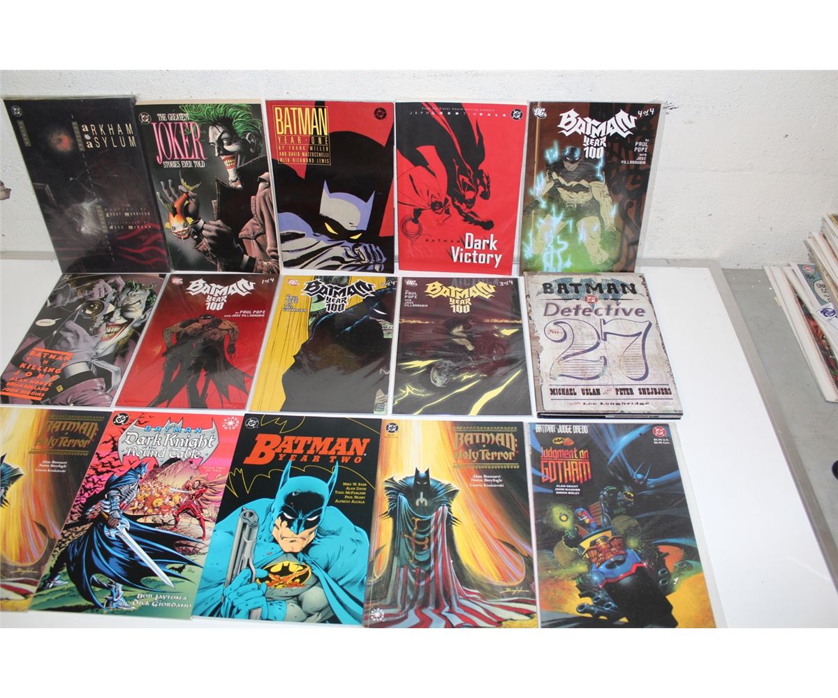 BATMAN TRADE PAPERBACKS & PRESTIGE FORMAT BOOK (1980'S-90'S) LARGE LOT OF 15 DIFFERENT BATMAN. INCLUDES ARKHAM ASYLUM HC, GREATEST JOKER STORIES, ETC. HIGH GRADE AVERAGE