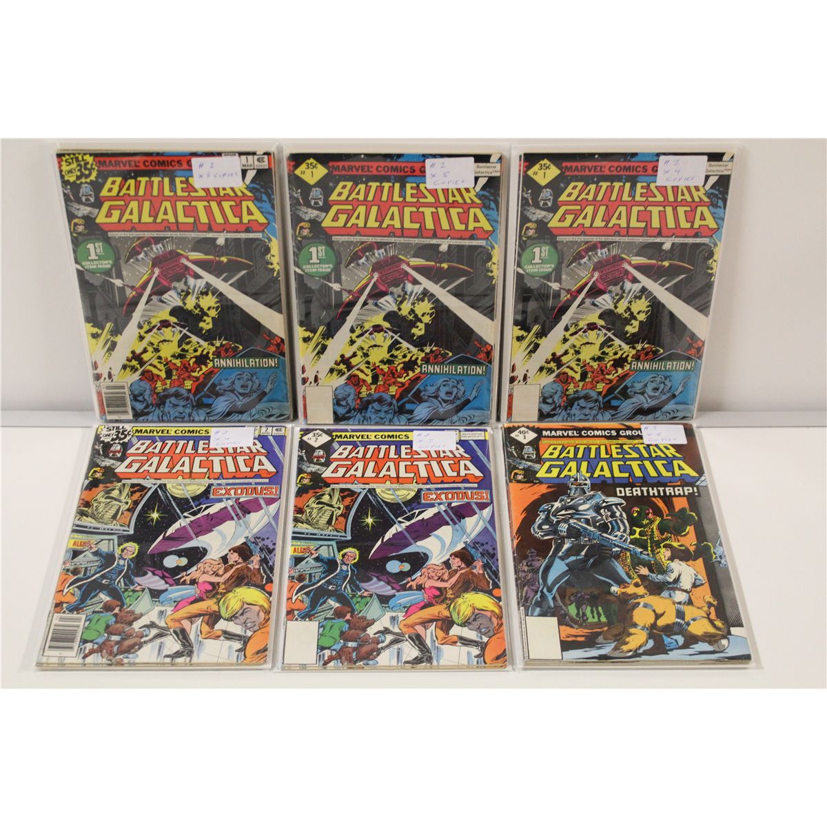 BATTLESTAR GALACTICA HUGE INVESTOR'S LOT (MARVEL) (1979) LARGE LOT OF 53 BATTLESTAR GALATICA BOOKS, INCLUDES #1 (X 14 COPIES), #2(X 6 COPIES #3(X5 COPIES), ETC. INVEST NOW, NEW MOVIE COMING 2014! 2013 OVERSTREET TOP END GUIDE VALUE OF $600