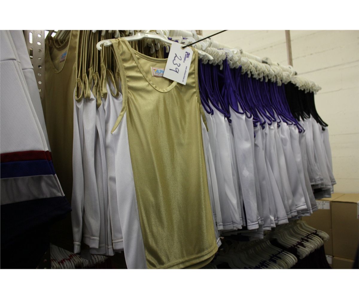 BAY OF BASKETBALL JERSIES. 45 GOLD/WHITE, 142 PURPLE/WHITE, 53 BLACK/WHITE. 240 TOTAL SOLD PER JERSEY, MUST TAKE ALL.