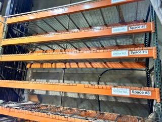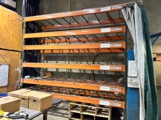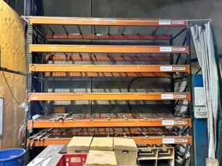 *BAY OF INDUSTRIAL PALLET RACKING INCLUDING 2 - 12' X 42" UPRIGHTS, 12 - 12' X 6.5" CROSS BEAMS, 18 MESH INSERTS AND 12' X 12' TARP CURTAIN *MUST HAVE PROPER EQUIPMENT AND PERSONNEL FOR REMOVAL*