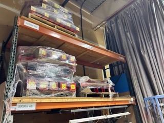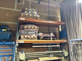 *BAY OF INDUSTRIAL PALLET RACKING INCLUDING 2 - 12' X 42" UPRIGHTS, 4 - 12' X 6.5" CROSS BEAMS, AND 2 WOOD INSERTS WITH WORK LIGHT ATTACHMENT *MUST HAVE PROPER EQUIPMENT AND PERSONNEL FOR REMOVAL*