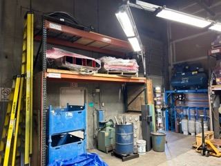 *BAY OF INDUSTRIAL PALLET RACKING INCLUDING 2 - 12' X 42" UPRIGHTS, 4 - 12' X 6.5" CROSS BEAMS, AND 2 WOOD INSERTS WITH WORK LIGHT ATTACHMENT *MUST HAVE PROPER EQUIPMENT AND PERSONNEL FOR REMOVAL*