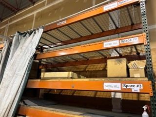 *BAY OF INDUSTRIAL PALLET RACKING INCLUDING 2 - 12' X 42" UPRIGHTS, 8 - 12' X 6.5" CROSS BEAMS, 6 MESH INSERTS, 2 WOOD INSERTS AND 12' X 12' TARP CURTAIN *MUST HAVE PROPER EQUIPMENT AND PERSONNEL FOR REMOVAL*