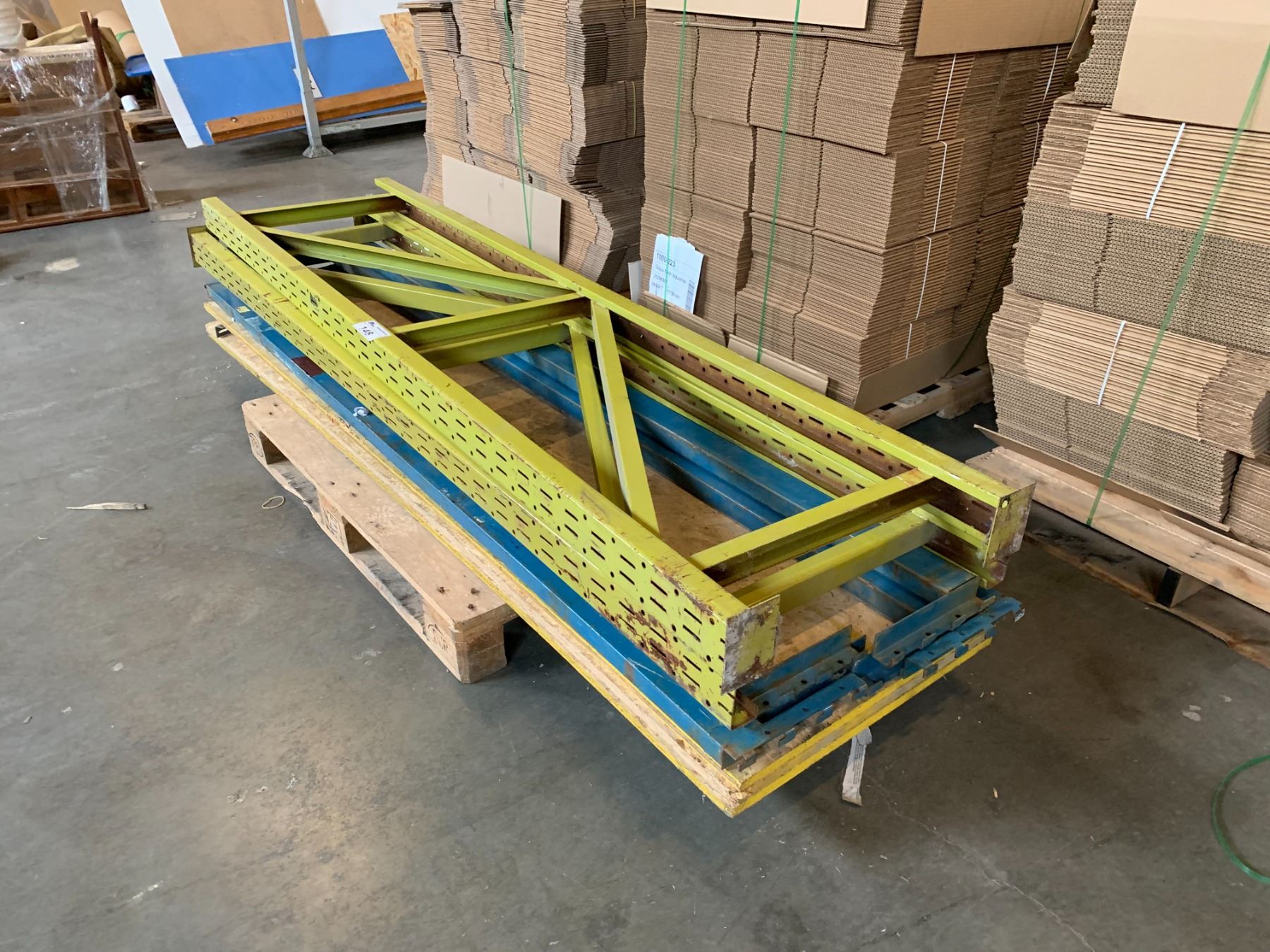 BAY OF OF INDUSTRIAL SHELVING INCLUDING 2 - 8.5' X 2' UPRIGHTS, 6 - 8' CROSS BEAMS AND WOOD SHELF INSERTS