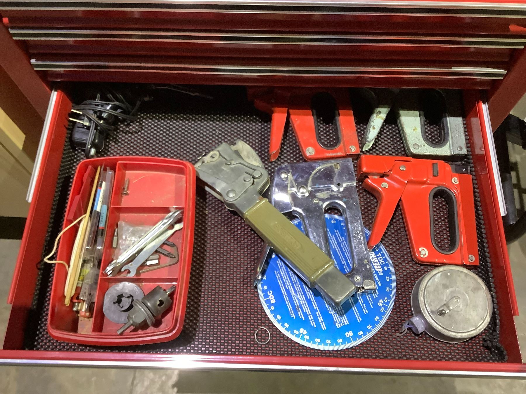 BEACH 6 DRAWER TOOLBOX WITH MASTERCRAFT ROLLING 7 DRAWER TOOL CHEST, WITH TOOL CONTENTS, GRINDER,
