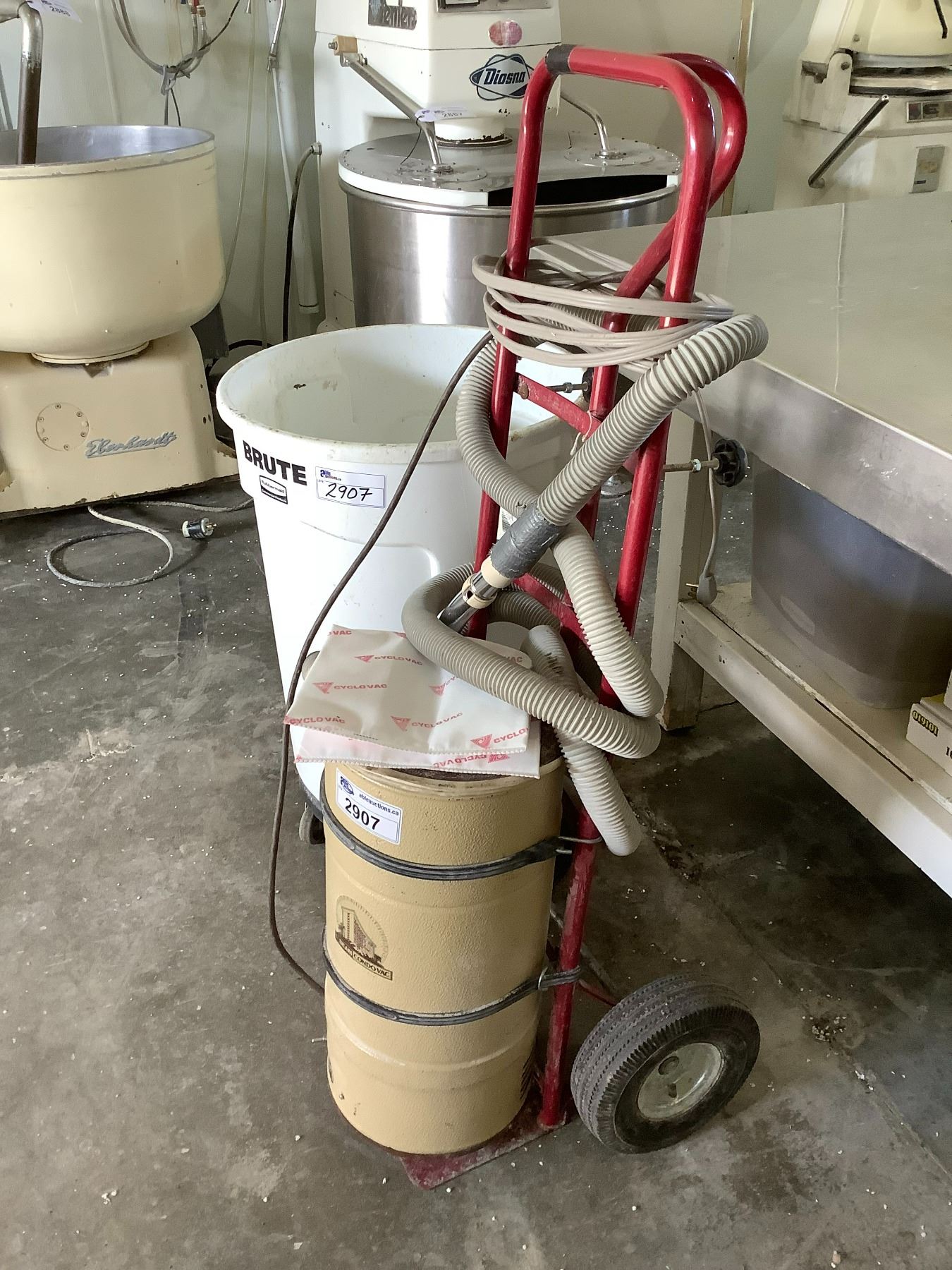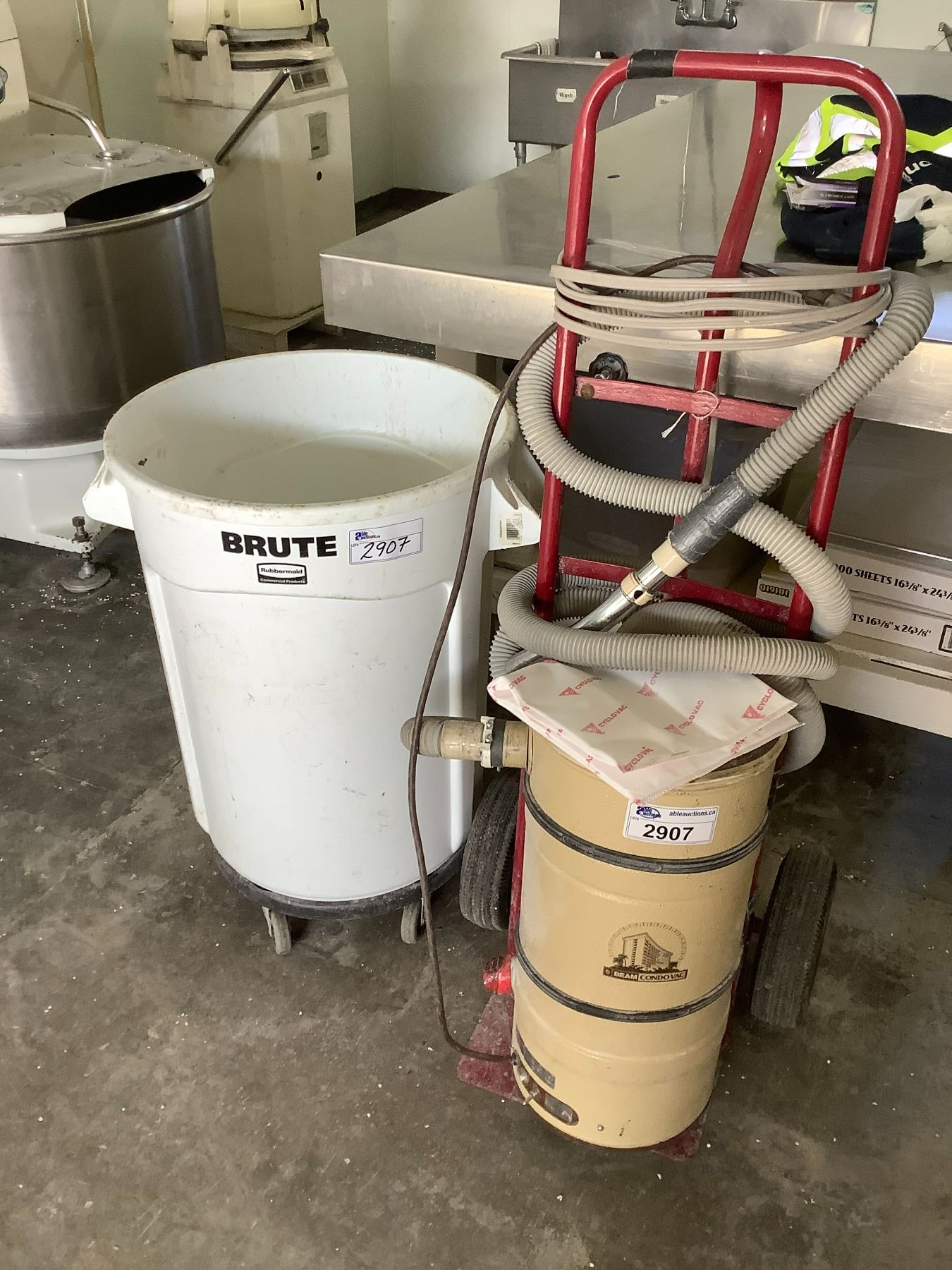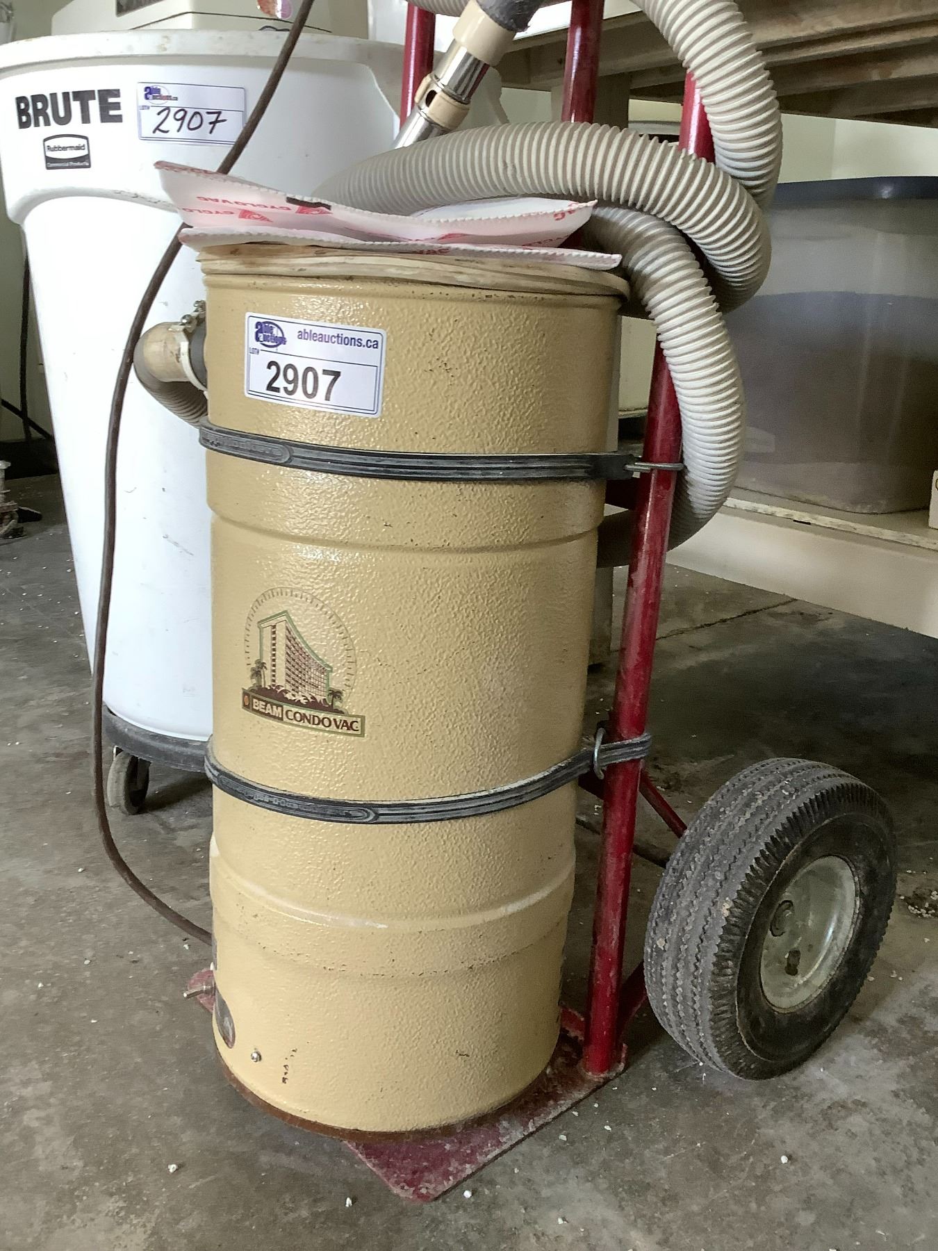 BEAN VAC SYSTEM, 2 WHEEL DOLLY & MOBILE RUBBERMAID BRUTE GARBAGE BIN
