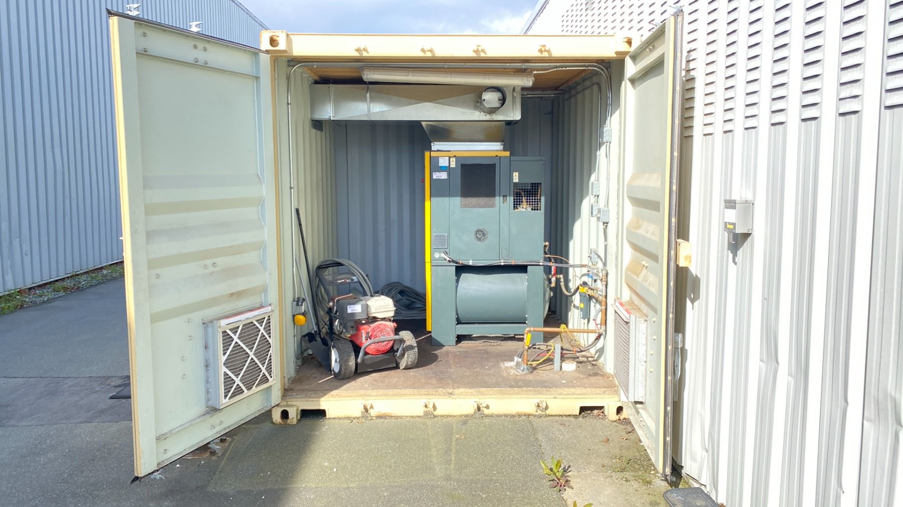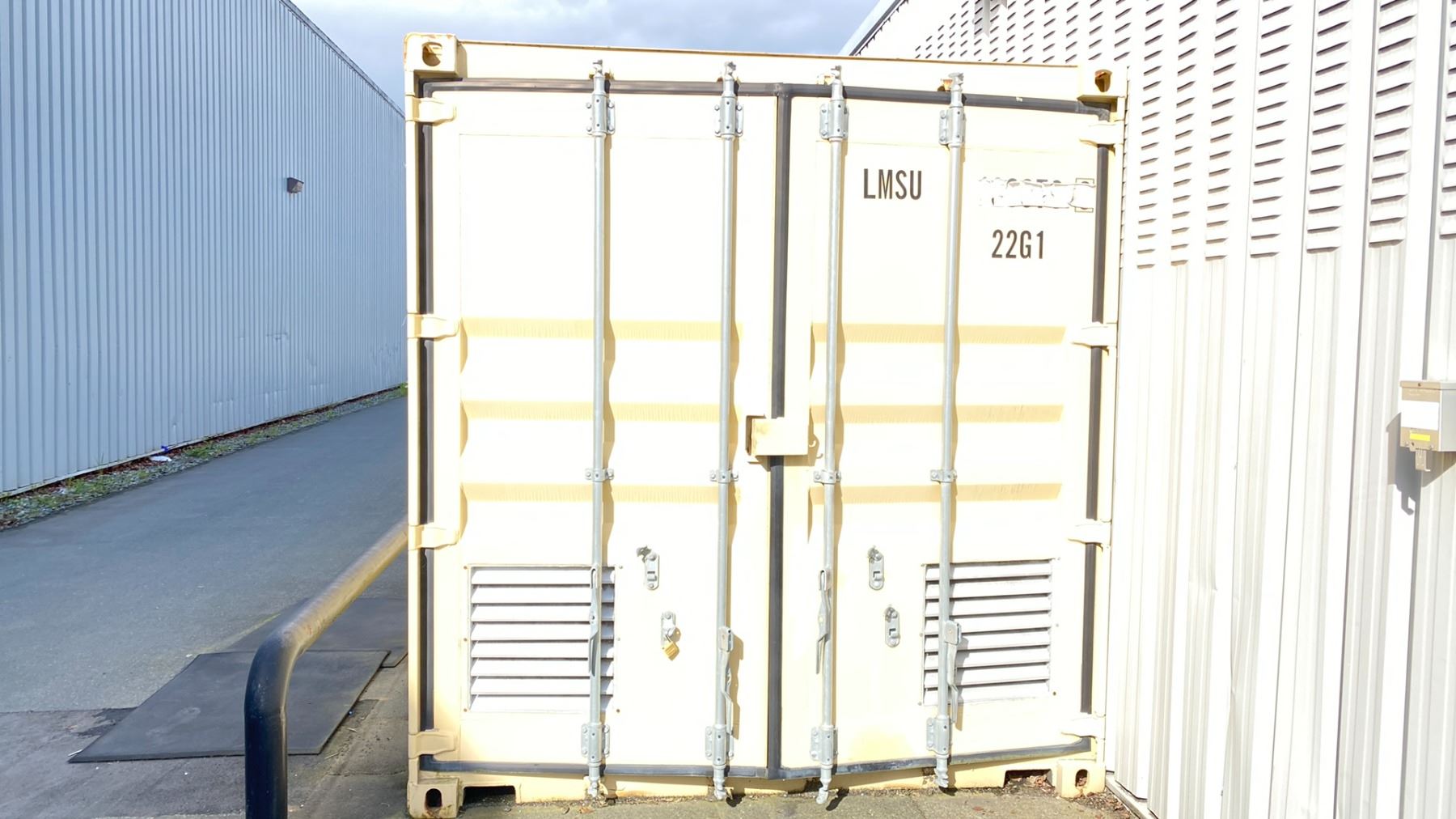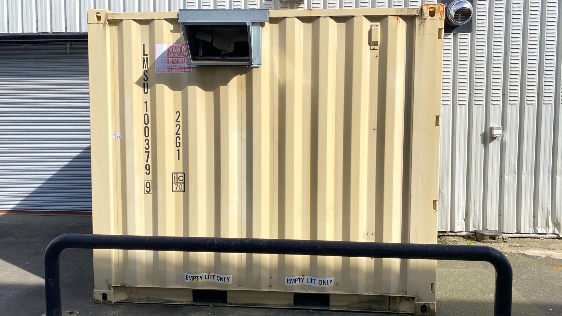 BEIGE 10' CONTAINER 10'X8'X102"H HAS VENTILATION HOLES AND SOME HOLES IN FLOOR FOR ACCESS *LAST DAY FOR REMOVAL, REQUIRES HIAB/CRANE OR TILT DECK FOR REMOVAL*
