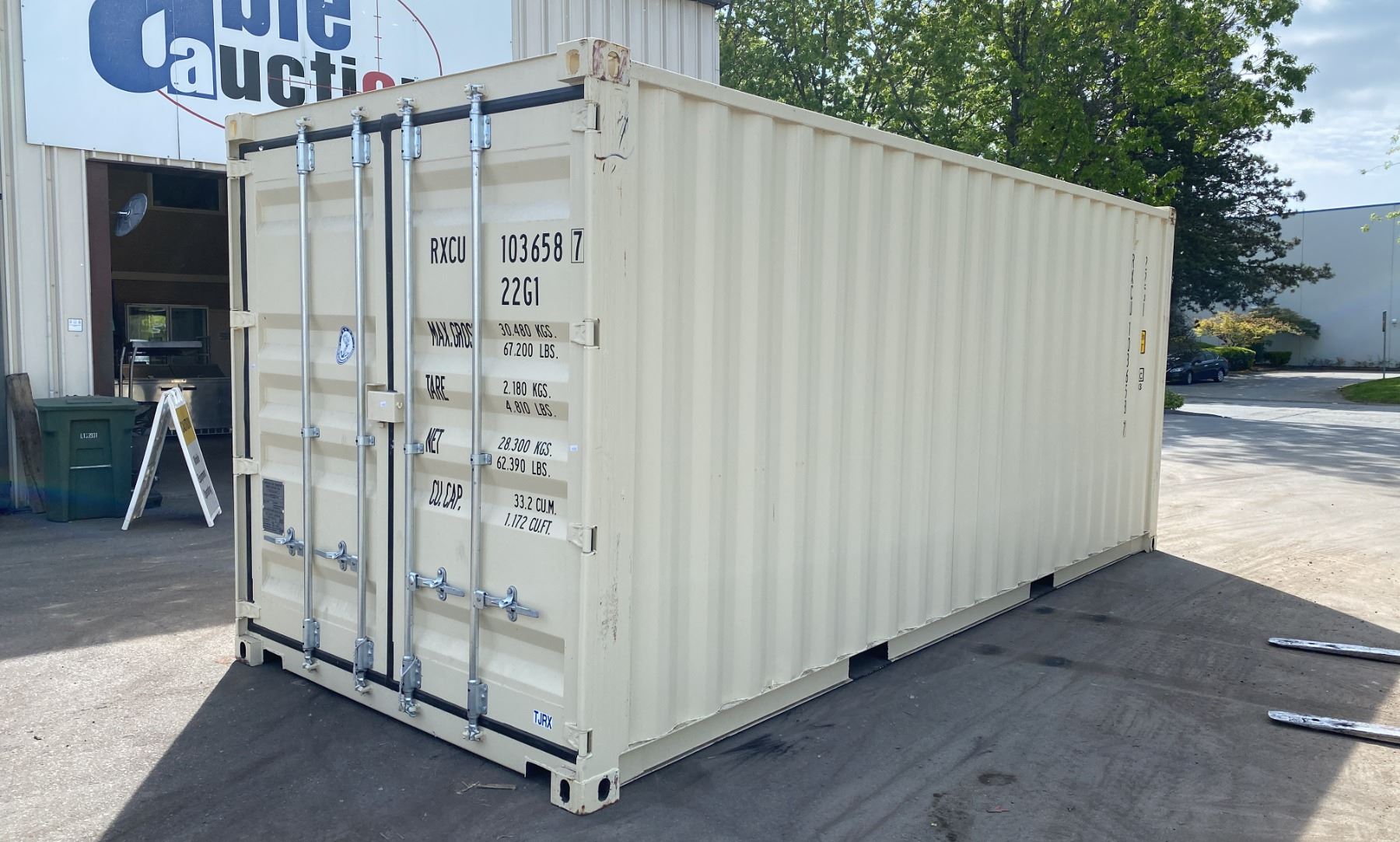 BEIGE 20' 67,200 MAX CAPACITY INDUSTRIAL TRANSPORT CONTAINER WITH DUAL SWING REAR DOOR, & CAM LOCKS, 20'L X 96"W X 101"H - CIMU 027938 1 *REQUIRES HIAB CRANE OR TILT DECK TRAILER TO TRANSPORT*