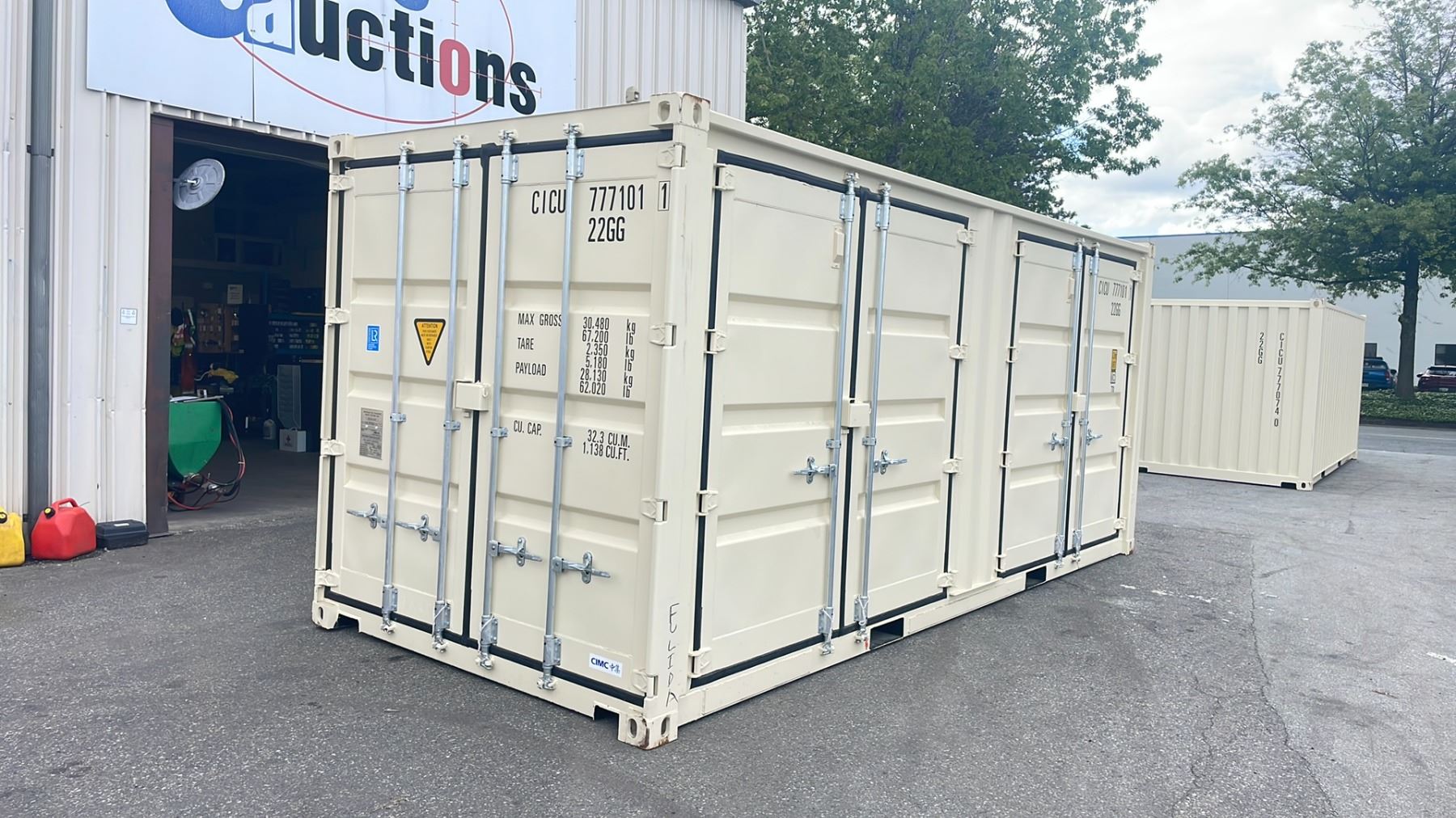 BEIGE 20' 67,200 MAX CAPACITY INDUSTRIAL TRANSPORT CONTAINER WITH DUAL SWING REAR DOOR, 2 DUAL SWING SIDE DOORS & CAM LOCKS, 20'L X 96"W X 101"H - CICU 777101 1 *REQUIRES HIAB CRANE OR TILT DECK TRAILER TO TRANSPORT*