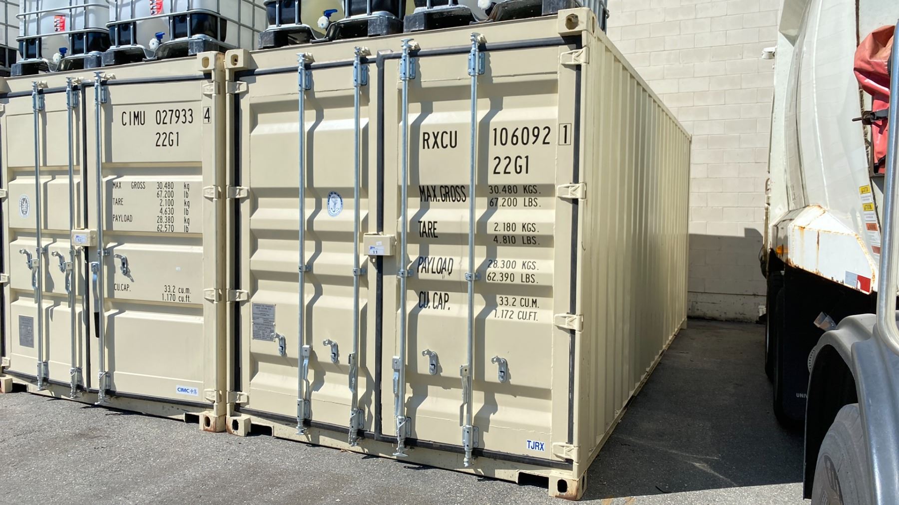 BEIGE 20' STANDARD CUBE 67,200 MAX CAPACITY INDUSTRIAL TRANSPORT CONTAINER WITH DUAL SWING REAR DOOR WITH CAM LOCKS 20'L X 96"W X 102, CONTAINER #RXCU 106092 1 *REQUIRES HIAB CRANE OR TILT DECK TRAILER TO TRANSPORT LAST DAY*