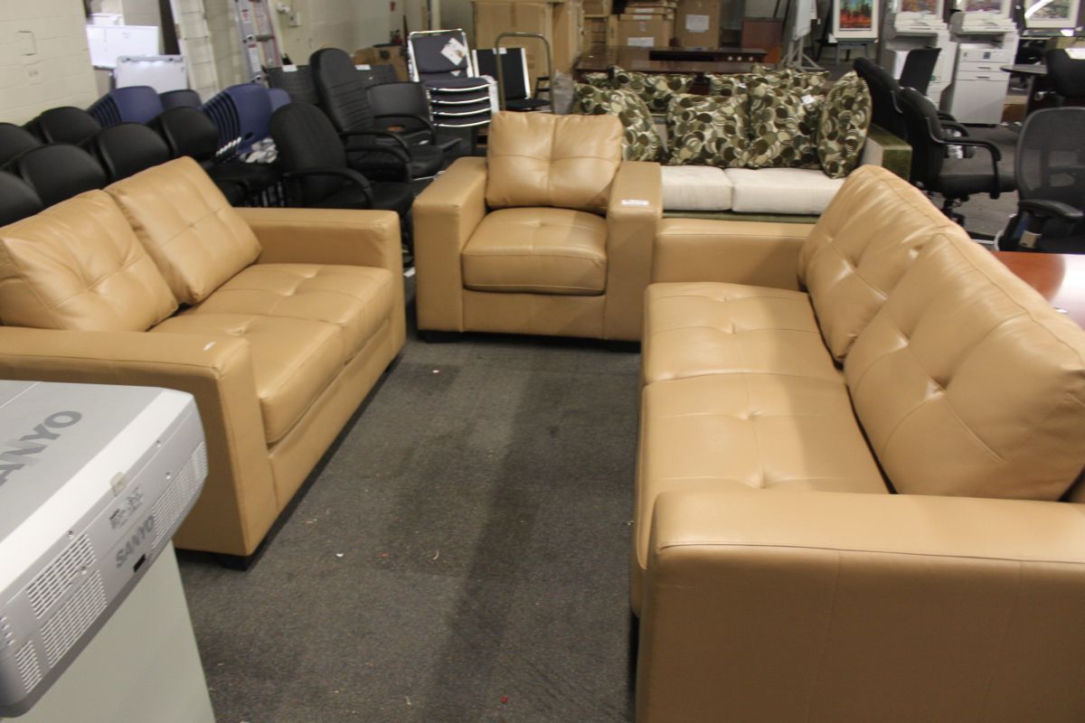 BEIGE 3 PIECE LEATHER SOFA, LOVESEAT & CHAIR
