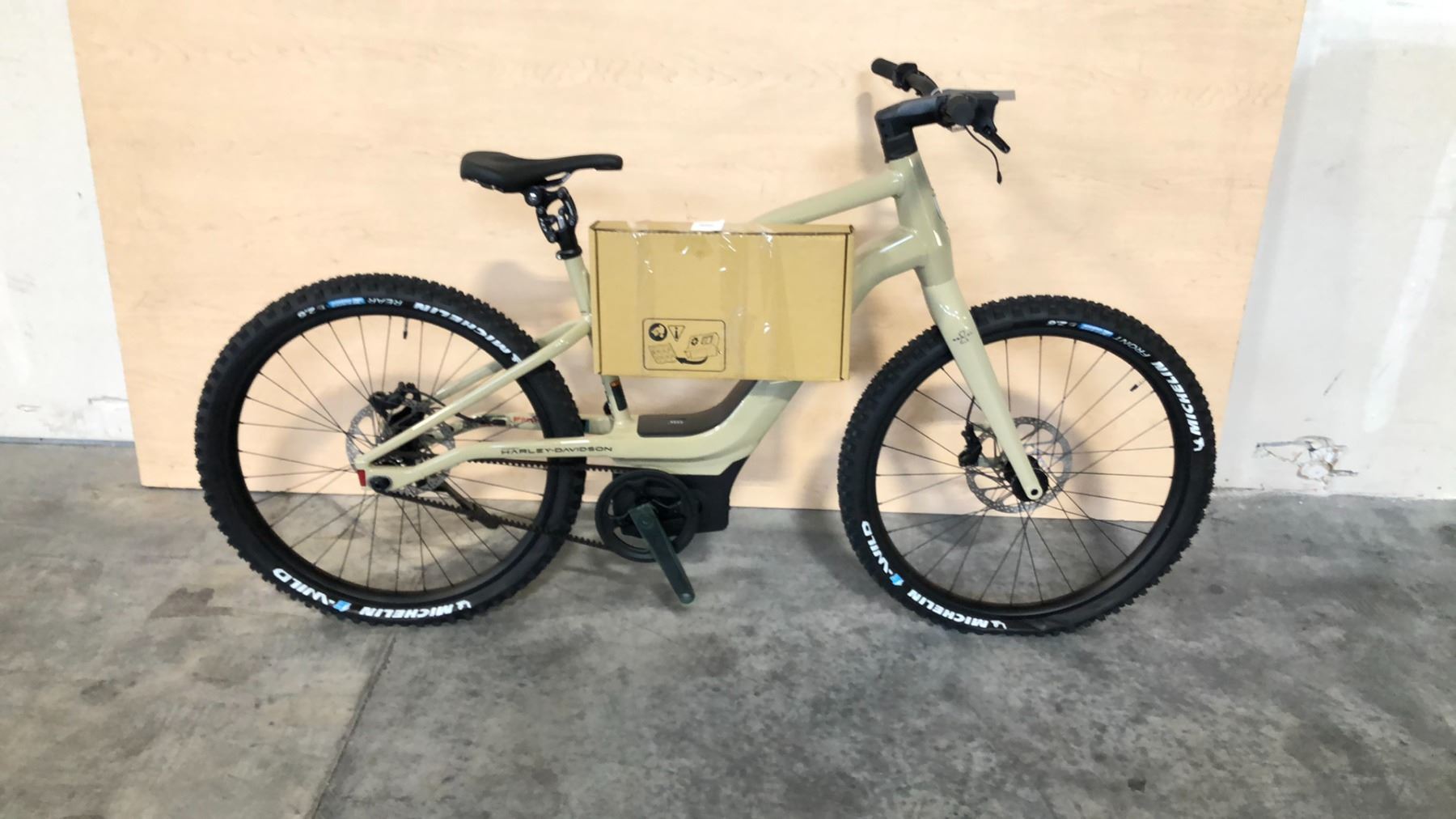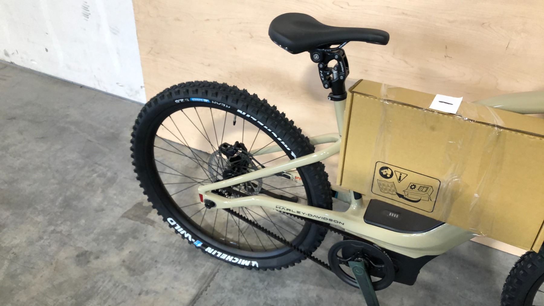 BEIGE HARLEY DAVIDSON BASH-MTN BELT DRIVEN ELECTRIC BICYCLE WITH BATTERY, CHARGER, KEYS AND PEDALS