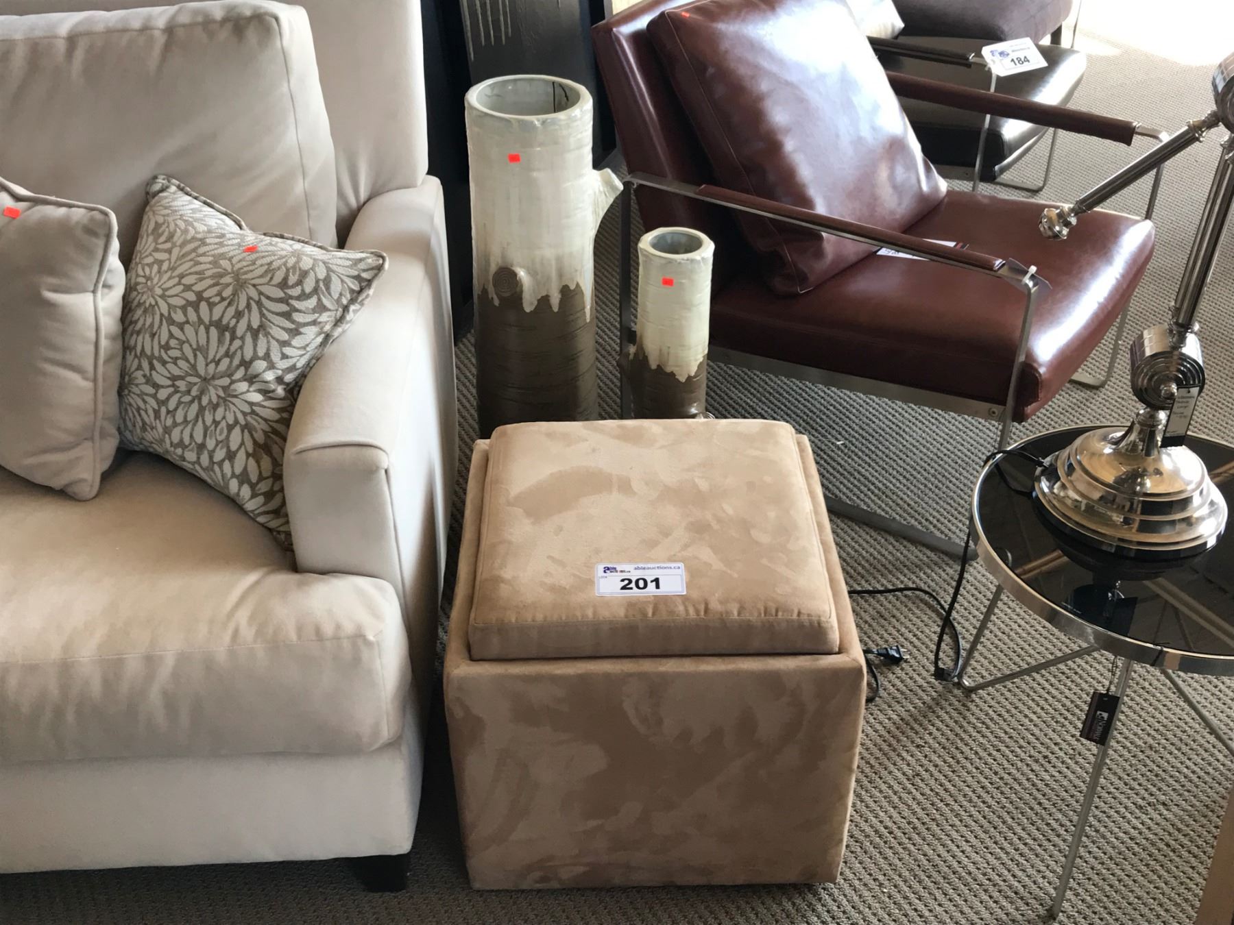 BEIGE MICRO FIBER STORAGE OTTOMAN WITH 2 LOG VASES