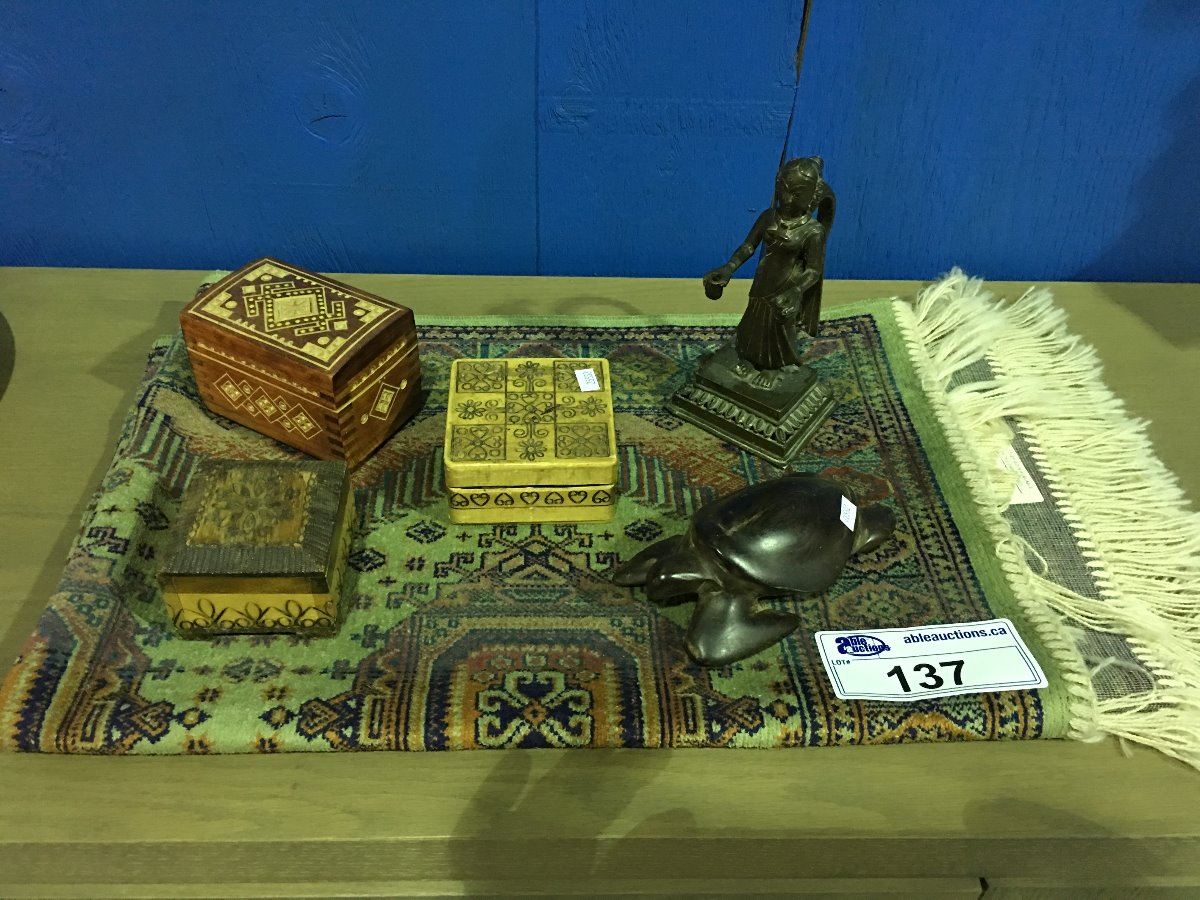 BELGIUM FINE KNOTTED SMALL RUG, 3 WOODEN KEEPSAKE BOXES, TURTLE CARVING AND A BRONZE BUDDA