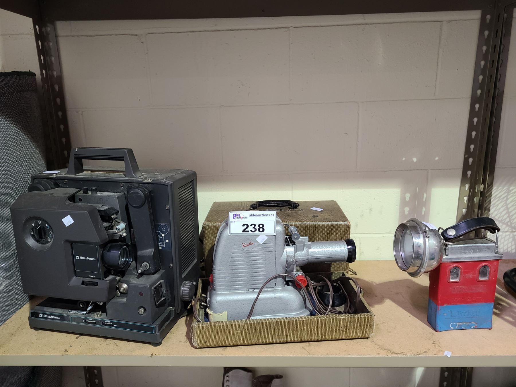 BELL & HOWELL VIDEO CAMERA, VIEWLEX PROJECTOR, & KOEHLER FLASHLIGHT