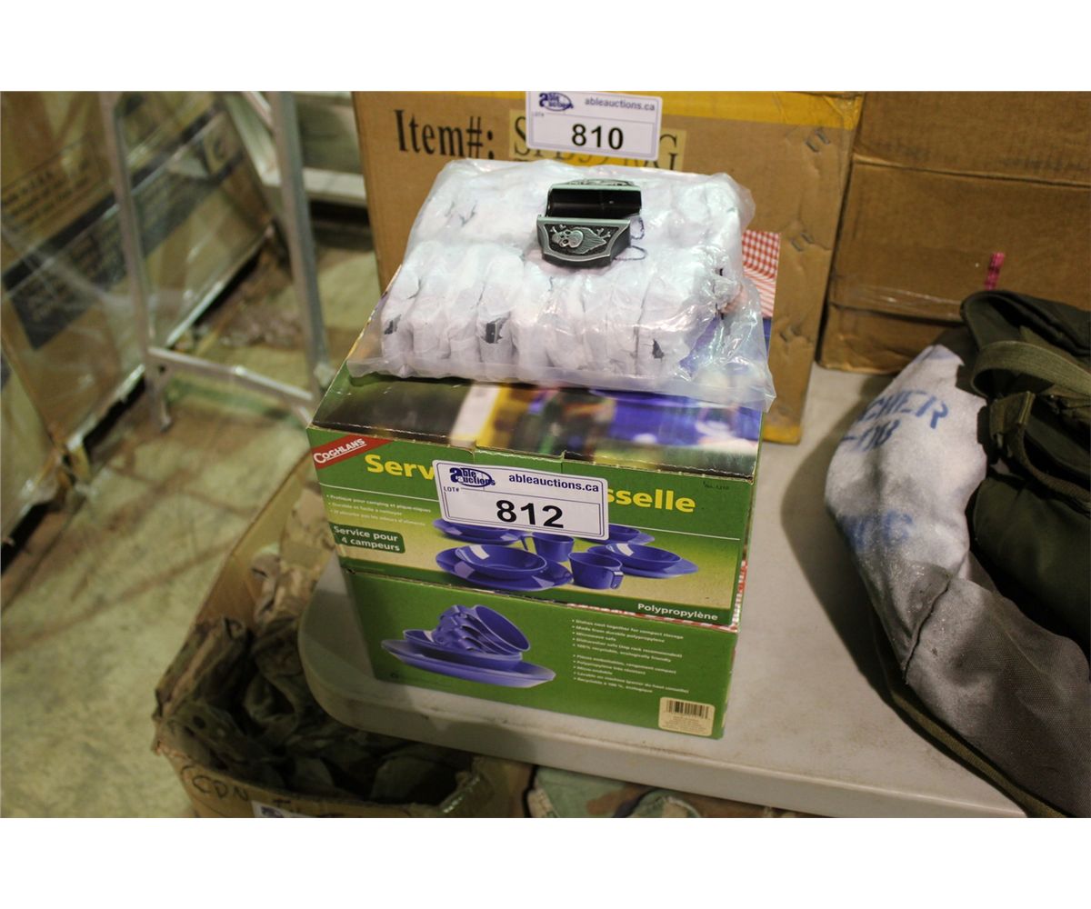 BELT BUCKLES AND 2 BOXES OF CAMPING DISHES