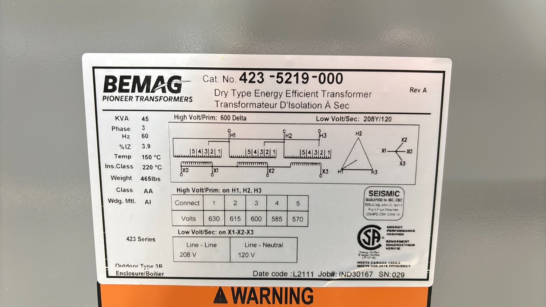 BEMAG 423-5219-000 3 PHASE DRY TYPE ENERGY EFFICIENT TRANSFORMER - 25"W X 23 1/2"D X 28"H