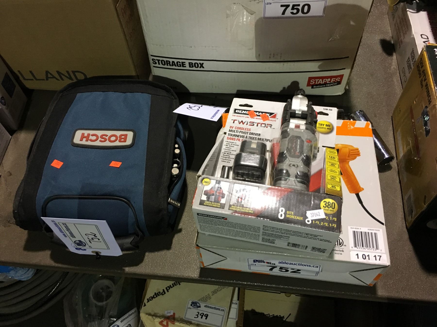 BENCHMARK TWISTOR 8VOLT CORDLESS PIVOT DRIVER, 24" FLEXIBLE HANDLE SOCKET WRENCH, HEAT GUN & BOSCH DRIVER TOOL