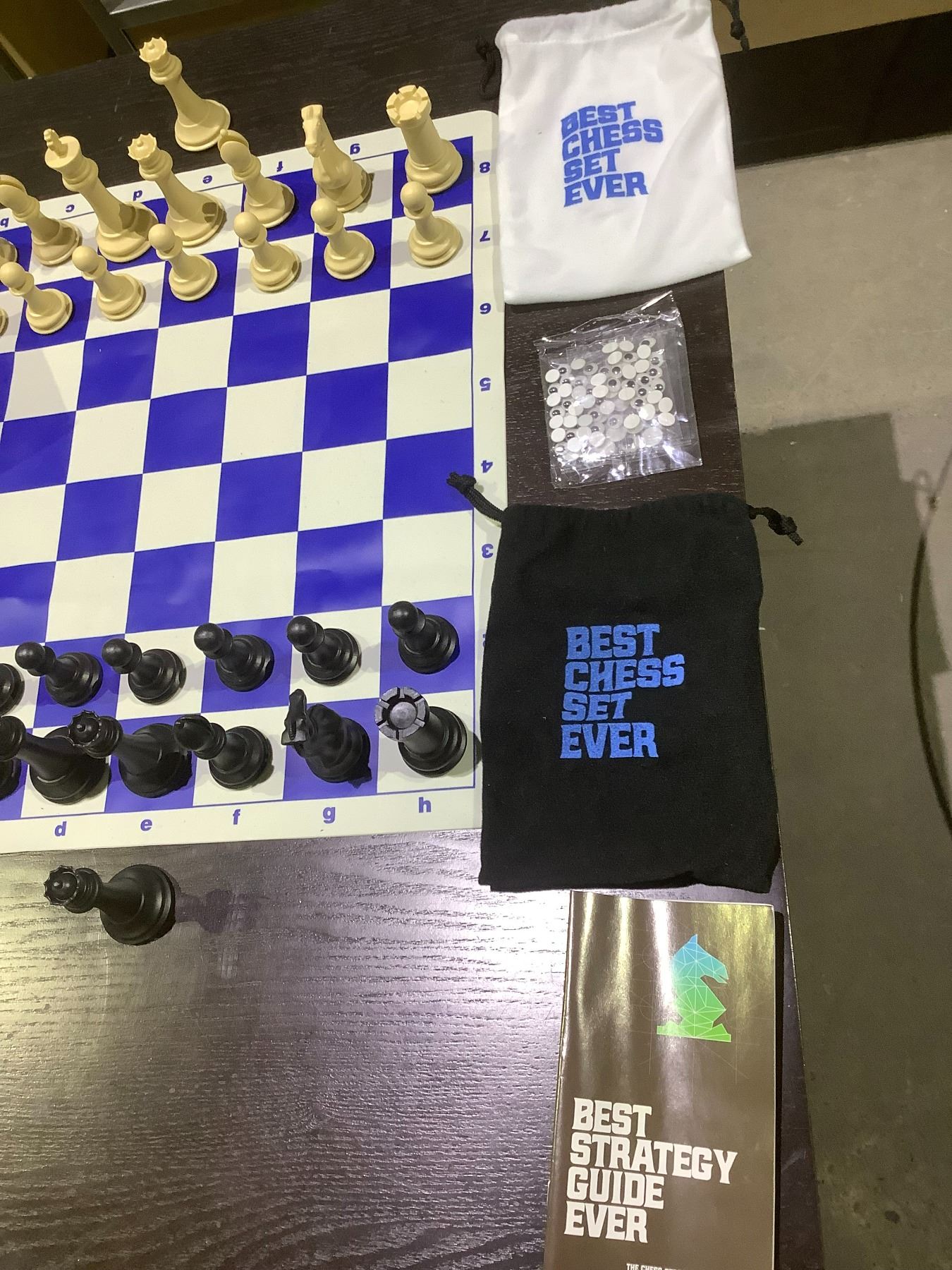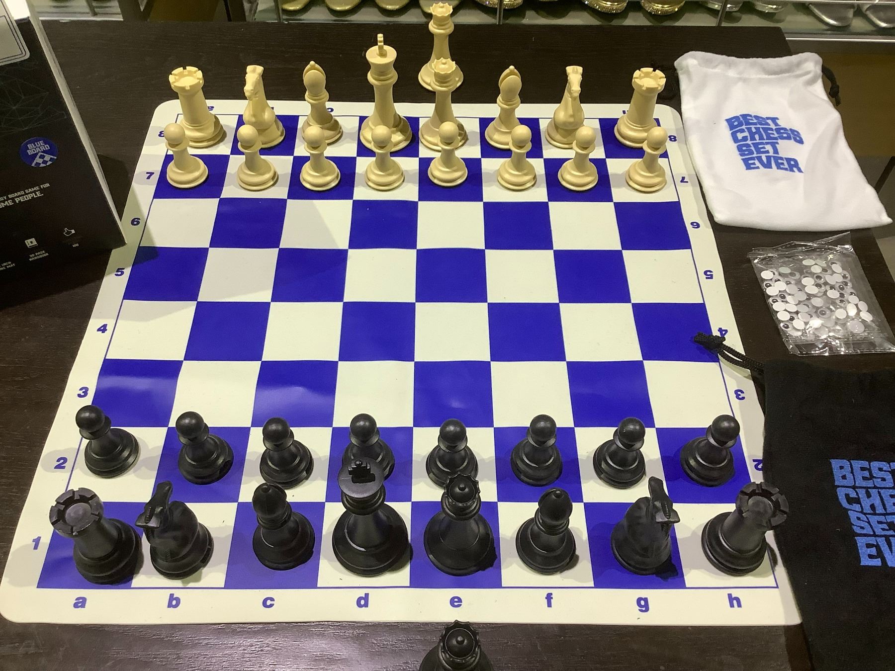 BEST CHESS SET EVER HEAVY WEIGHT EDITION, SILICON BLUE BOARD 20X20", 4X WEIGHTED PIECES, 30 PAGE HANDBOOK, BONUS QUEENS & BAG OF GOOGLY EYES