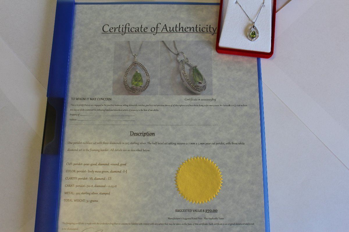 BEZEL SET PERIDOT NECKLACE WITH 3 DIAMONDS .70 CARAT VS CLARITY STERLING SILVER INCLUDES $270 CERTIFICATE