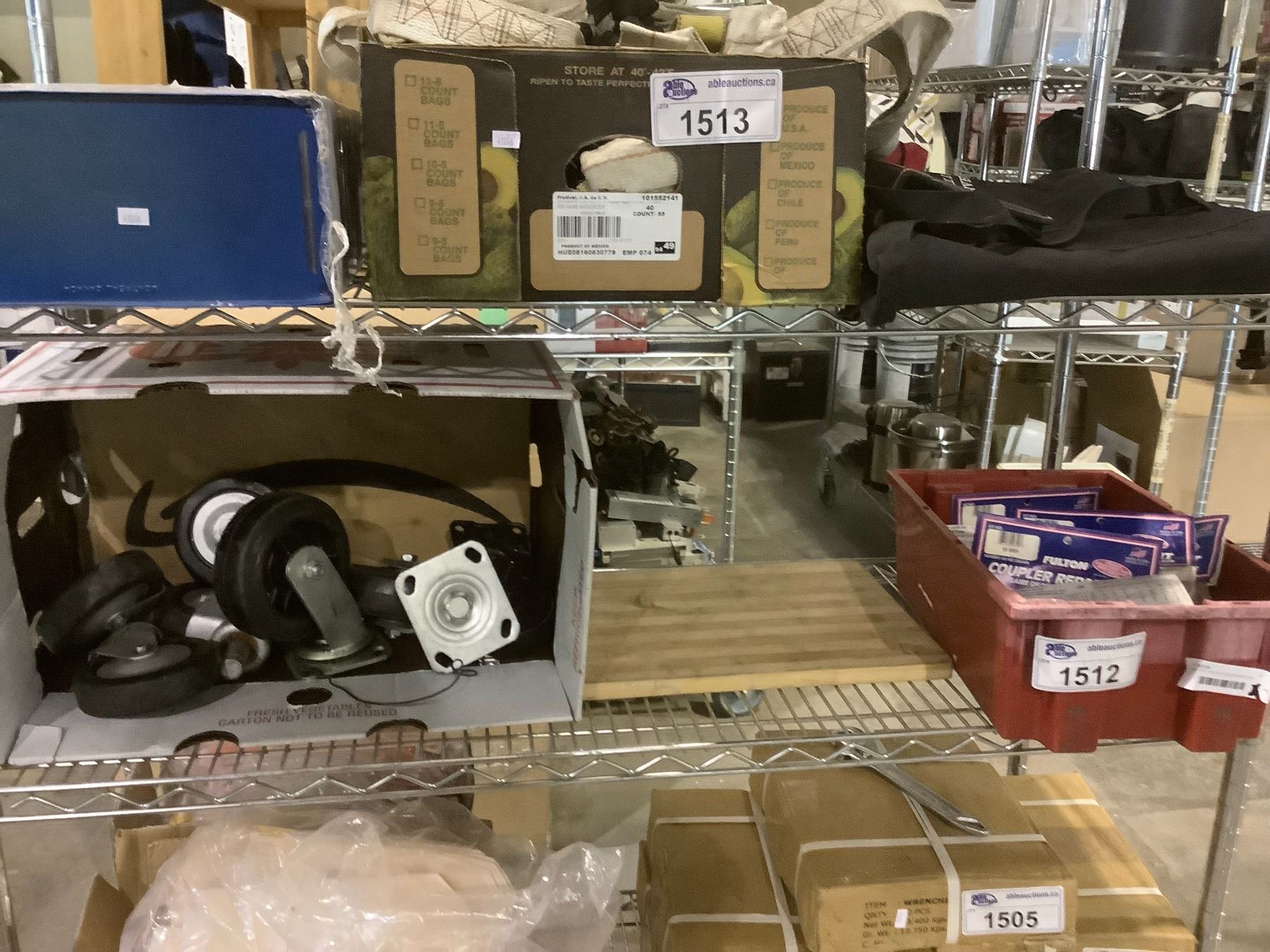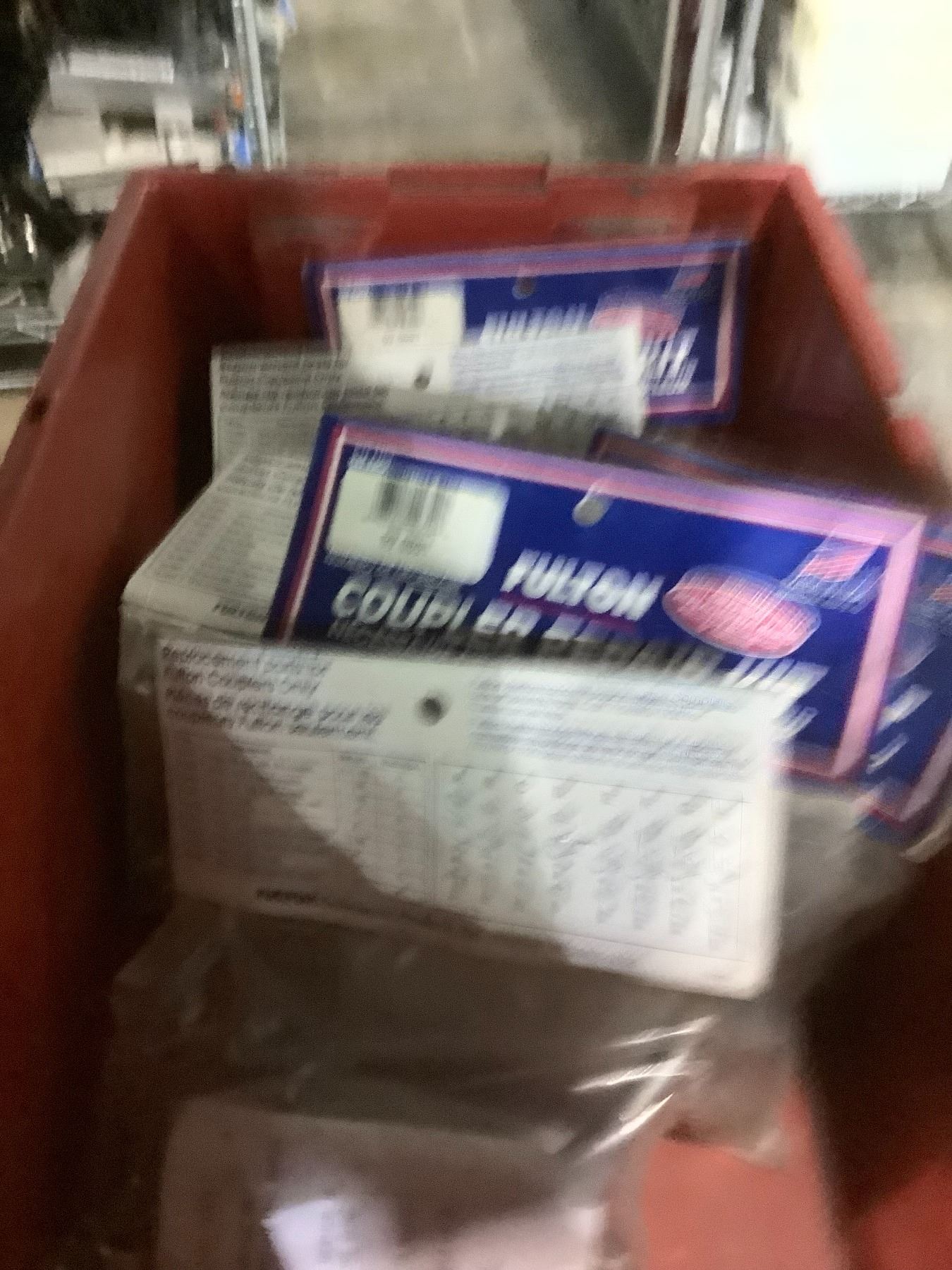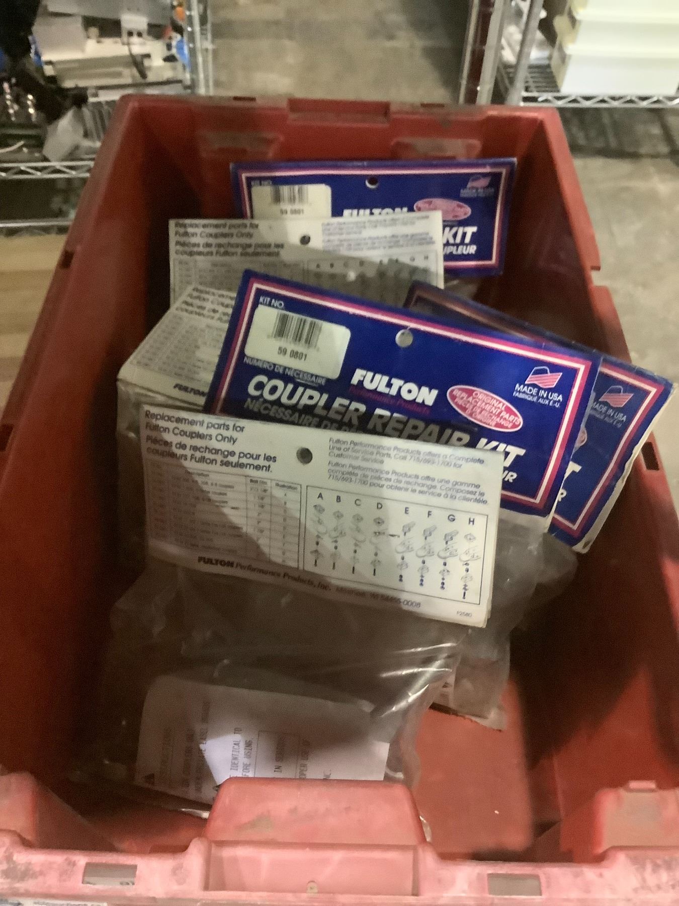 BIN OF 8 FULTON COUPLER REPAIR KITS NEW IN PACKAGING, WITH CUTTING BOARD AND CASTER WHEELS