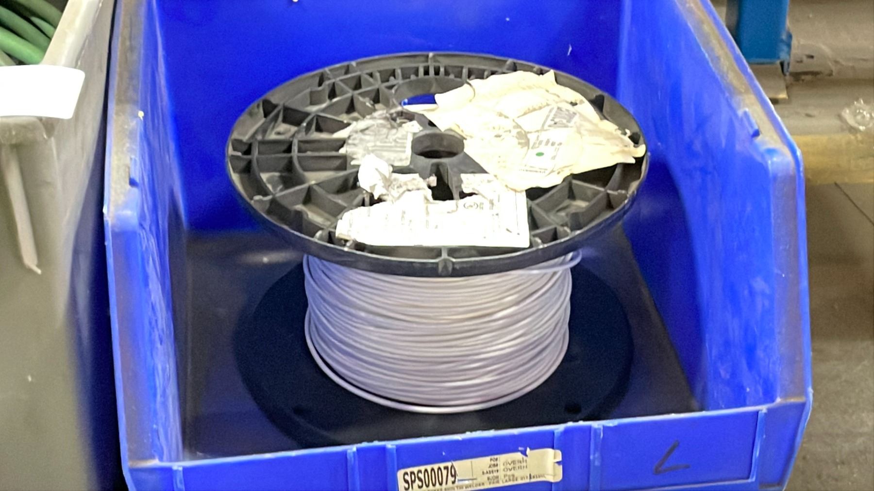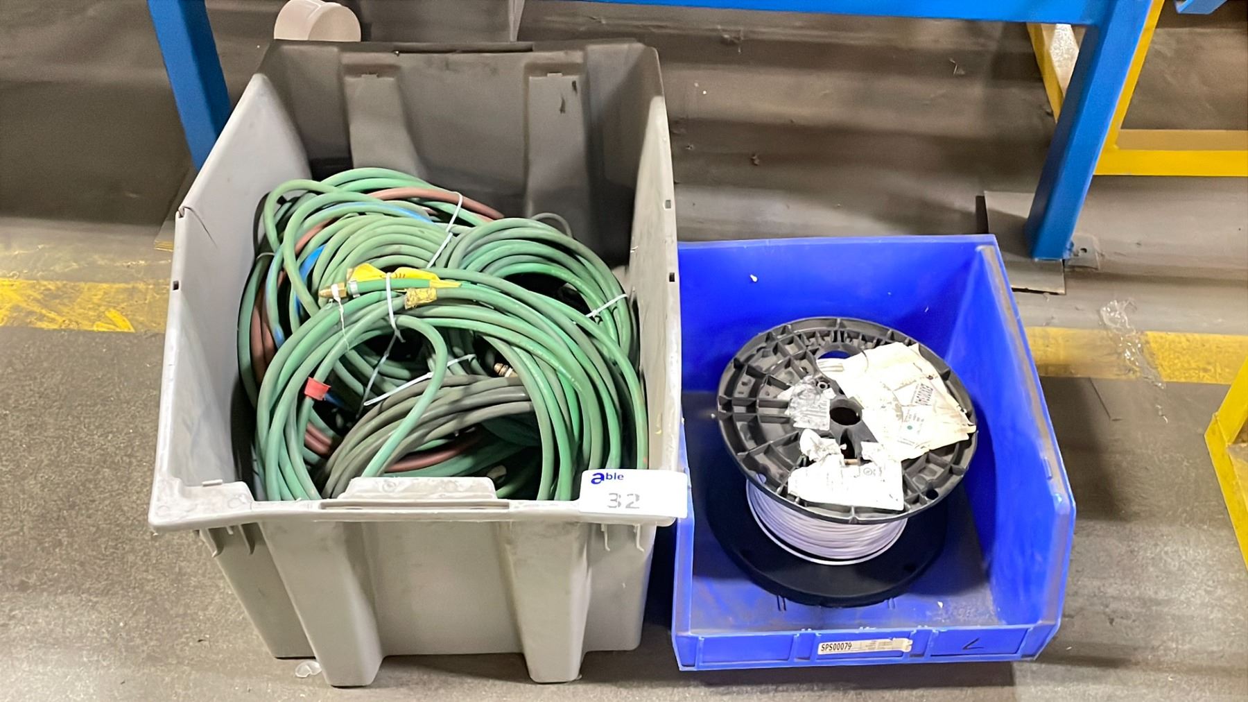 BIN OF AIR HOSE AND REEL OF MOISTURE RESISTANT 600 VOLT AWM ELECTRICAL WIRE