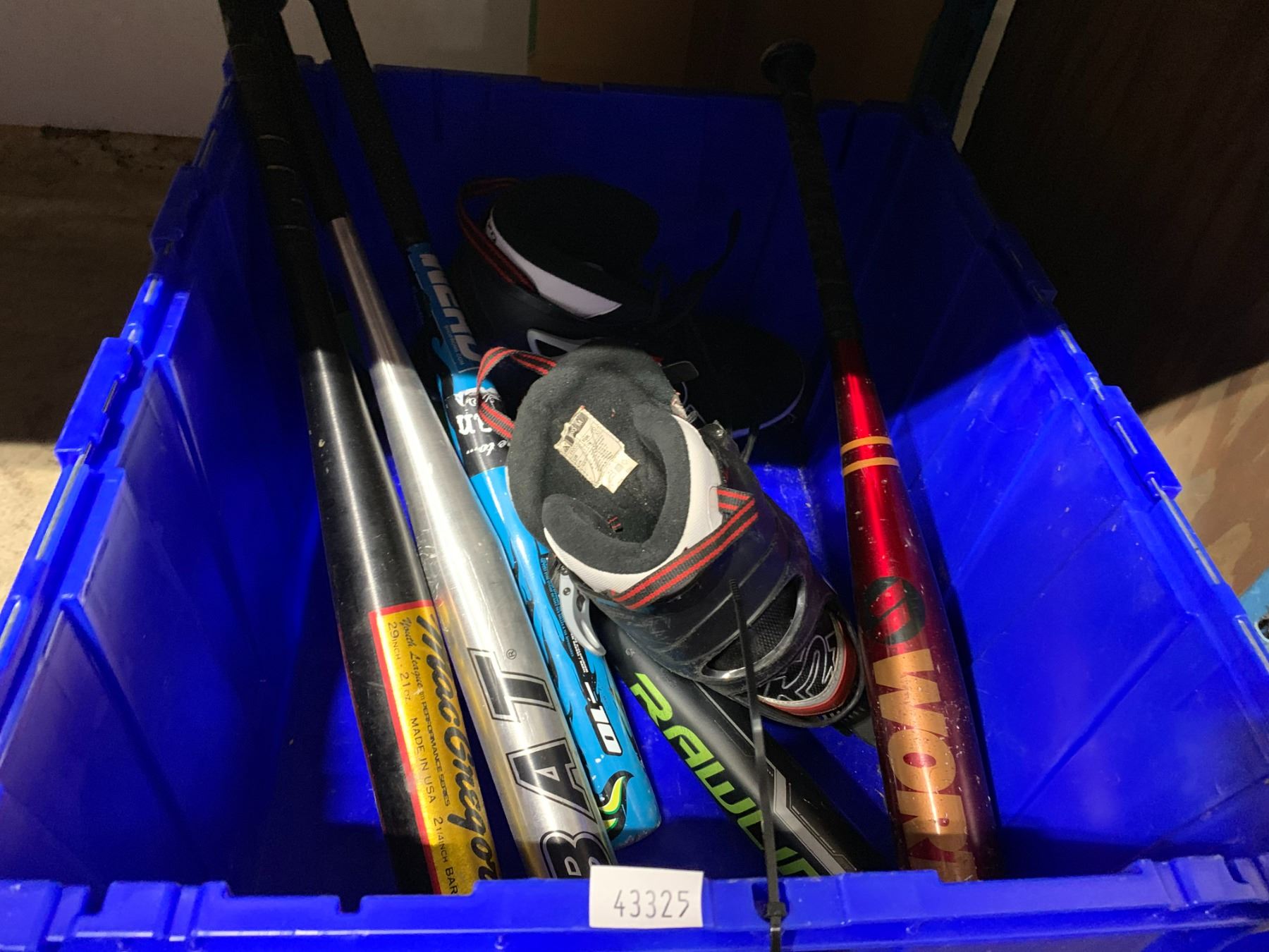 BIN OF ASSORTED BATS & SIZE 12 EXO SKI BOOTS ( BIN NOT INCLUDED )