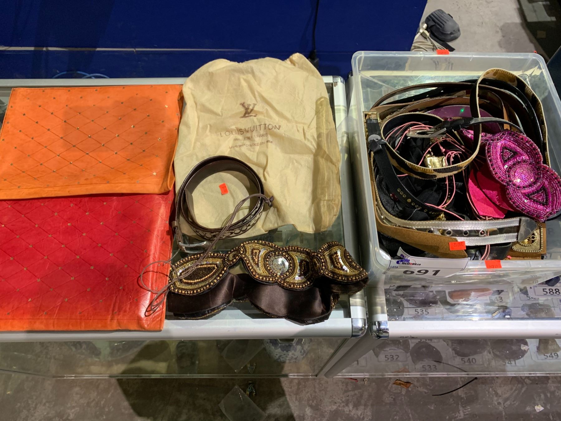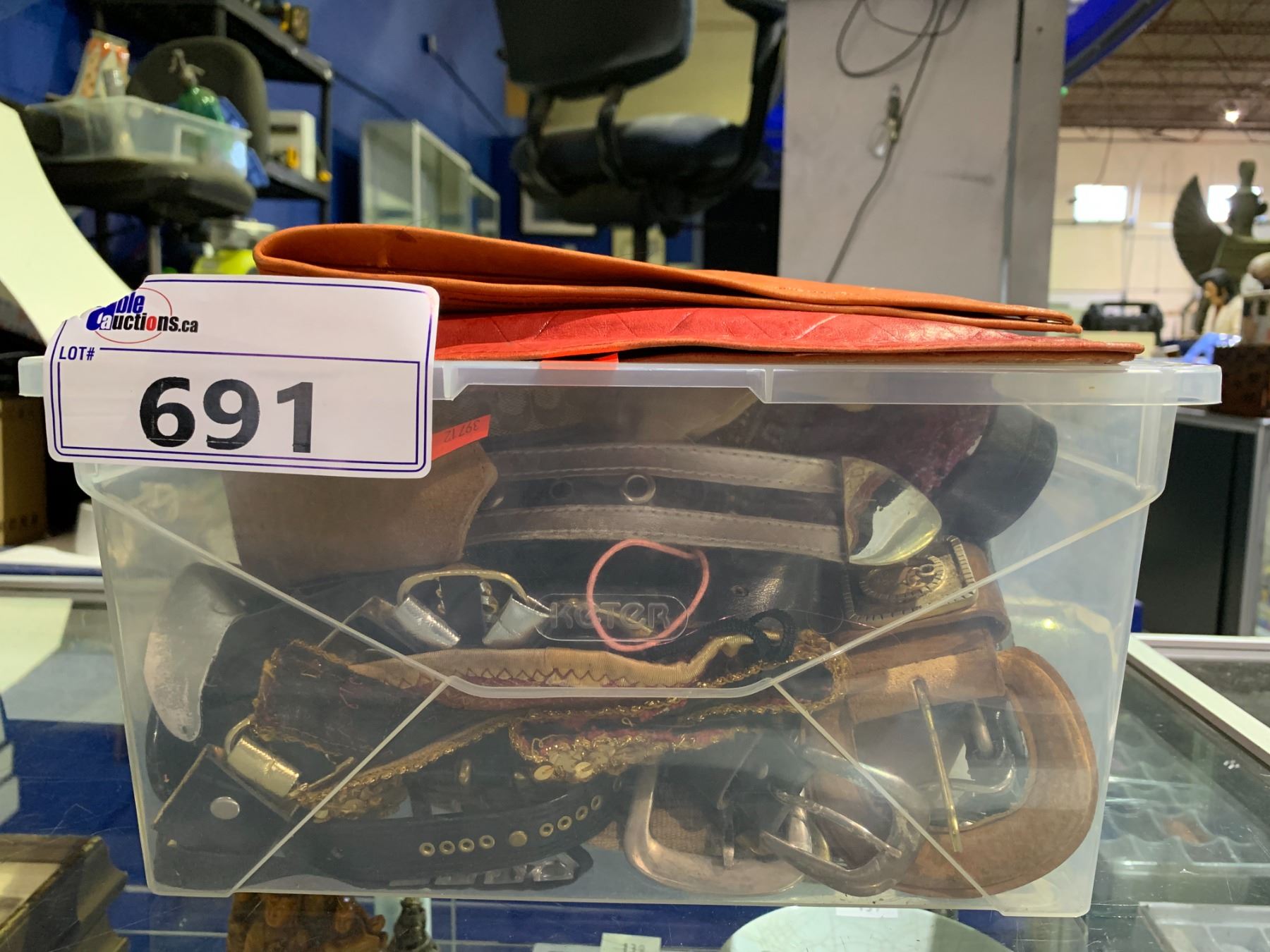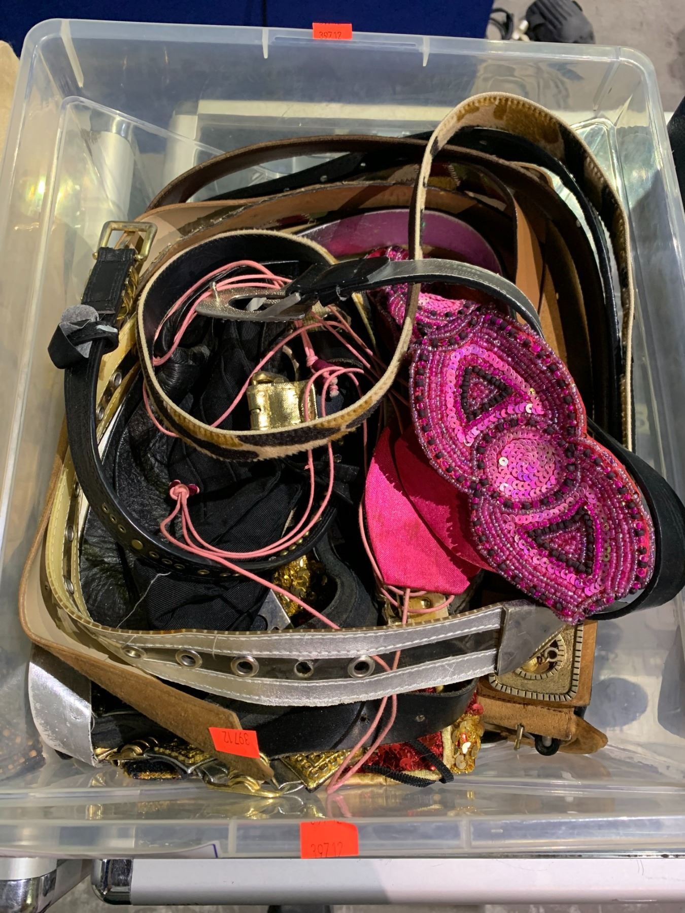 BIN OF ASSORTED BELTS & BOOK COVERS