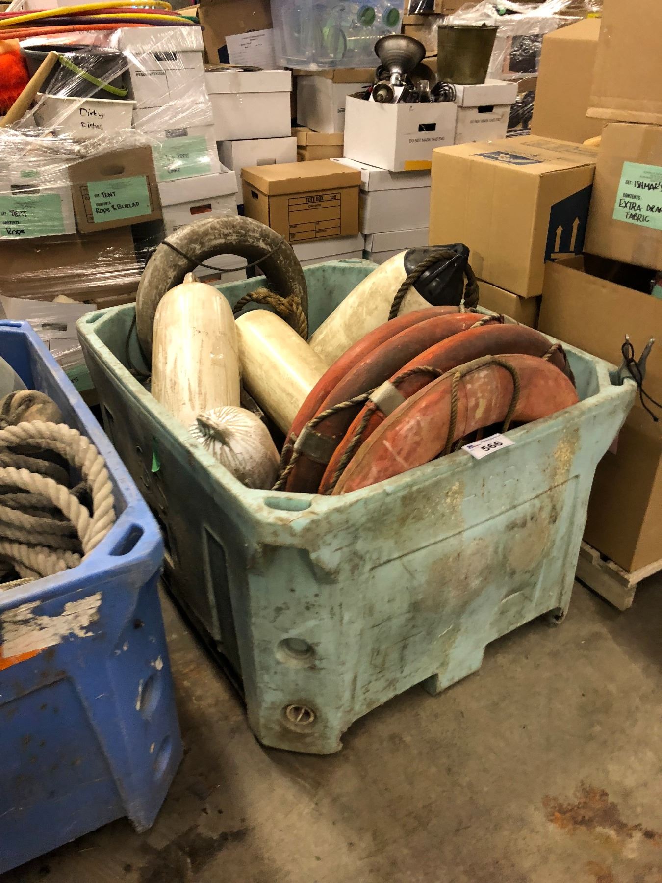 BIN OF ASSORTED BUOYS & MARINE PROPS