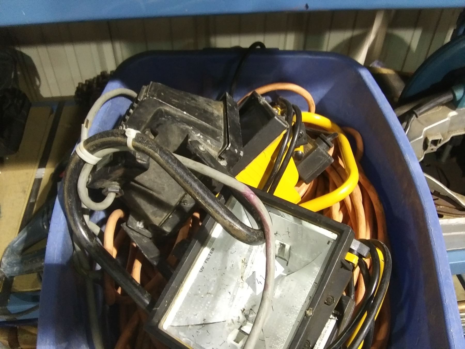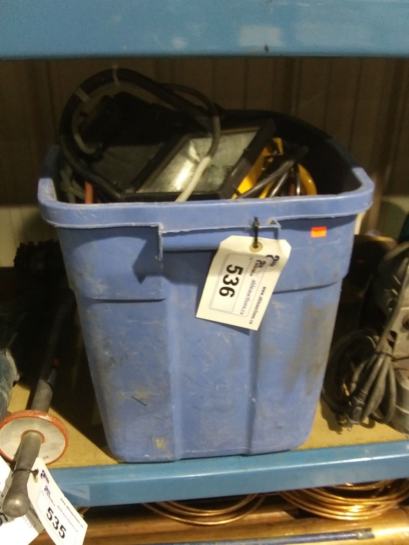 BIN OF ASSORTED EXTENSION CORDS & JOB SITE LIGHTING