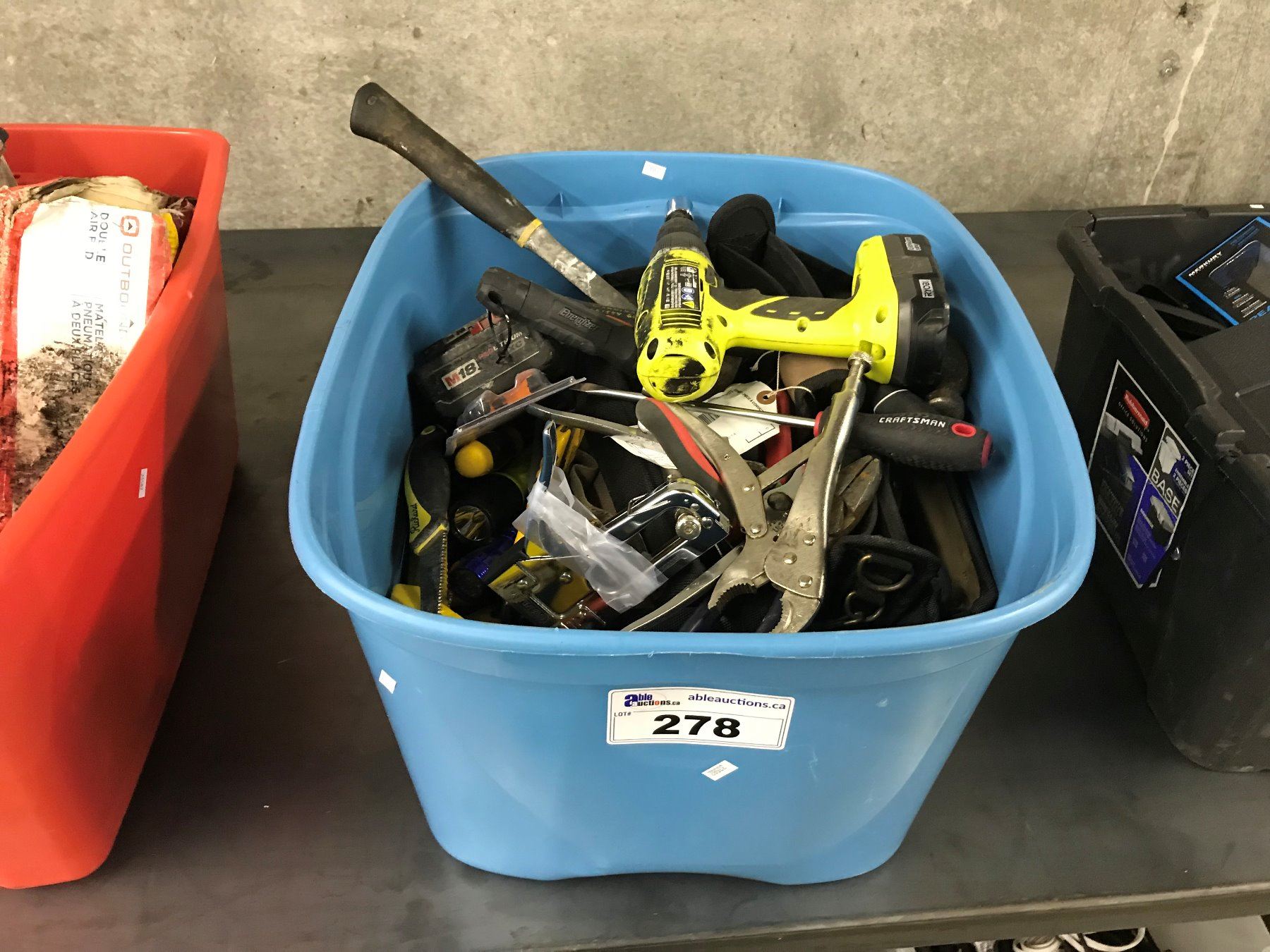 BIN OF ASSORTED HAND TOOLS/POWER TOOLS