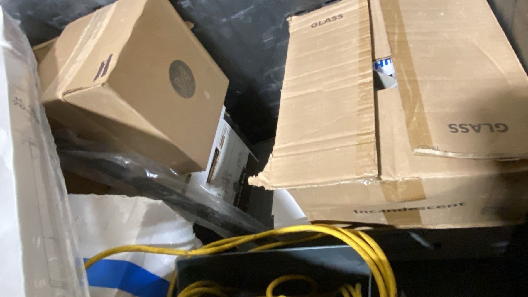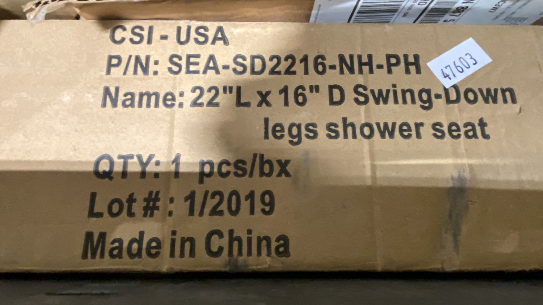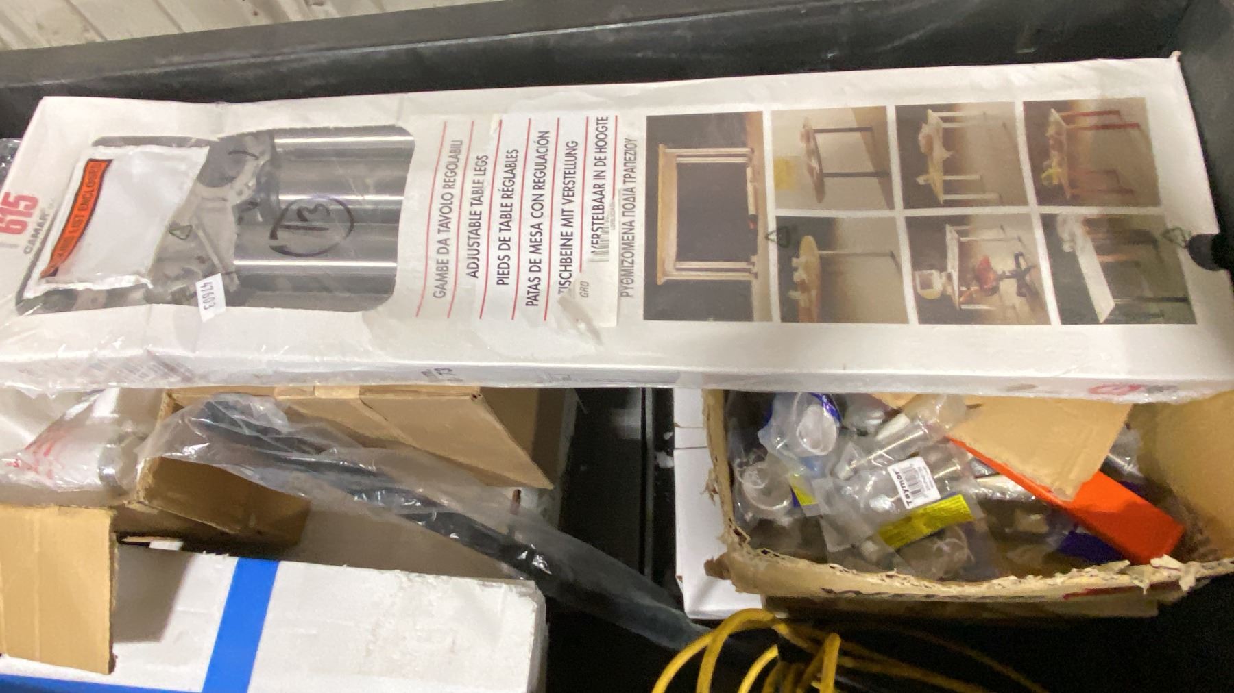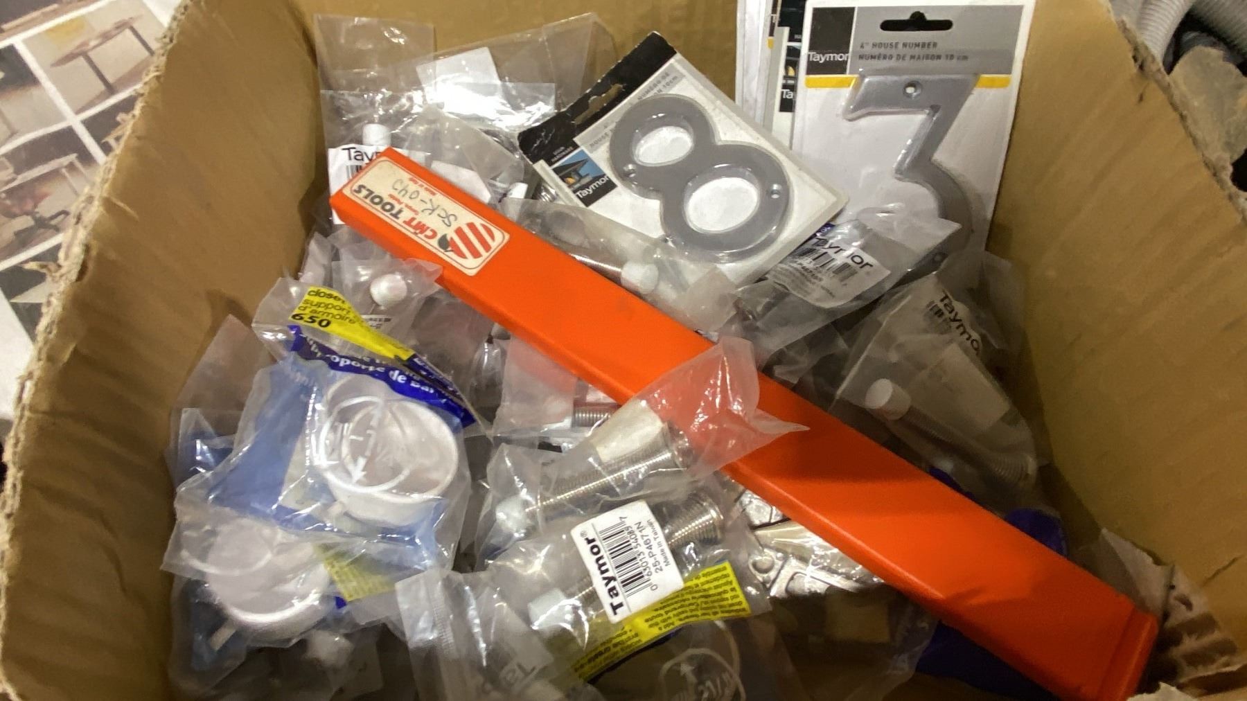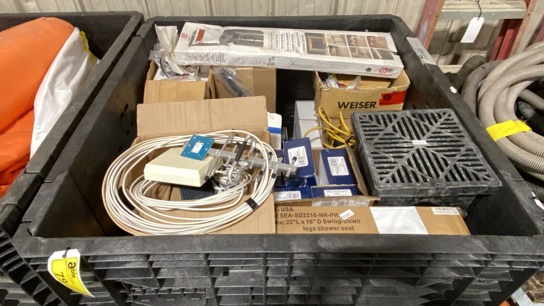 BIN OF ASSORTED HOME RENOVATION ITEMS INCLUDING WEISER DOOR HANDLES, WIRELESS WEATHER STATION, SWING DOWN SHOWER SEAT, DOOR STOPPERS, ADJUSTABLE TABLE LEGS & MORE *BIN NOT INCLUDED*
